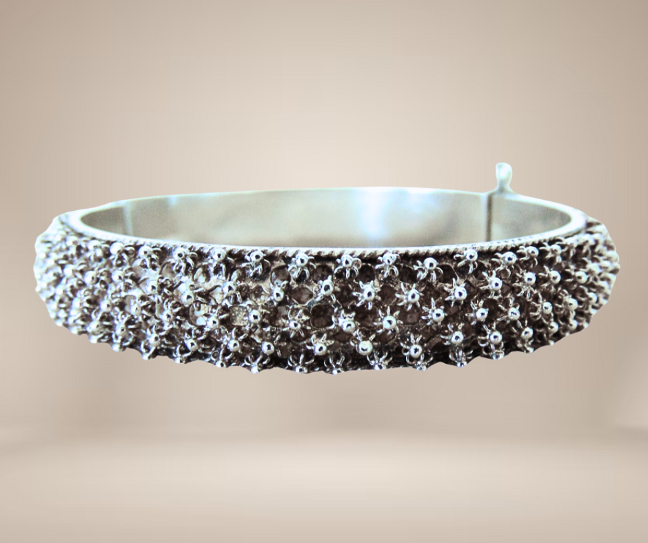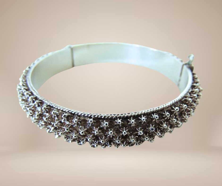 Schitterende vintage zilveren scharnier armband, met de hand gemaakt in Sardinië traditionele cannetille of cantille versiering rondom. De armband sluit goed met een daarvoor gemaakt pinnetje dat er niet uit kan vallen.