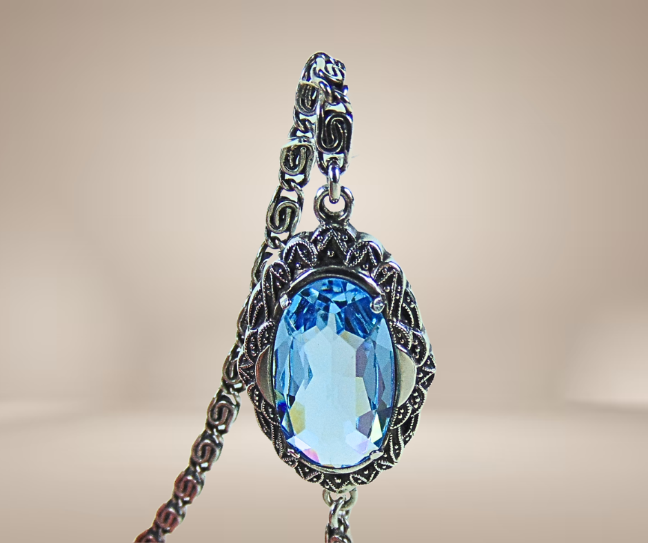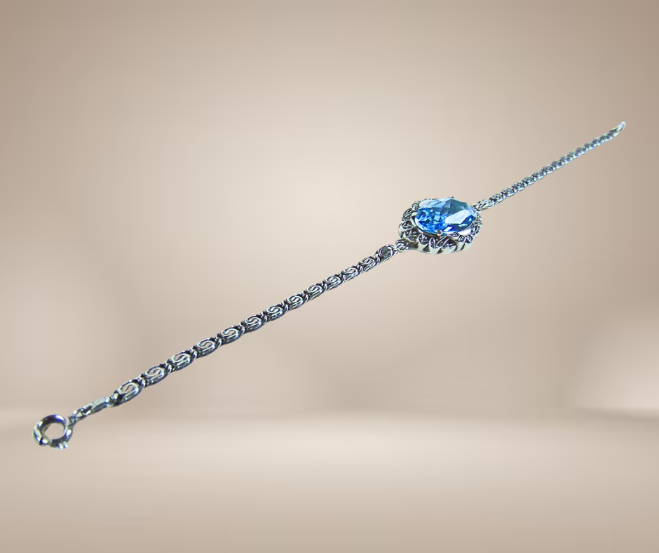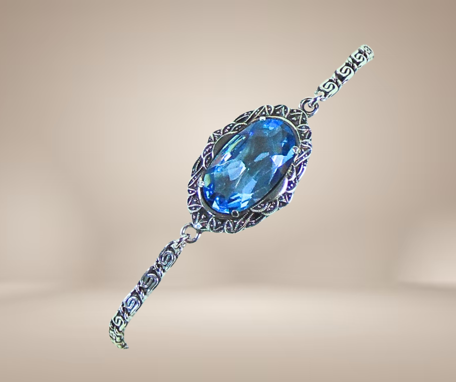 Een zeldzame Art Deco armband uit de jaren twintig, vervaardigd in tweede gehalte zilver met een grote ovaal geslepen blauwe paste steen in het midden. De helderblauwe topaaskleurige steen vangt het licht op in talloze facetten, omlijst door een fijn geometrisch patroon dat zo kenmerkend is voor de elegante Art Deco-stijl. De schakels zijn sierlijk, een uniek stuk vakmanschap uit een tijd waarin stijl nog met de hand werd gevormd. Naast het zilverkeur heeft het een helaas onleesbaar makersmerk.