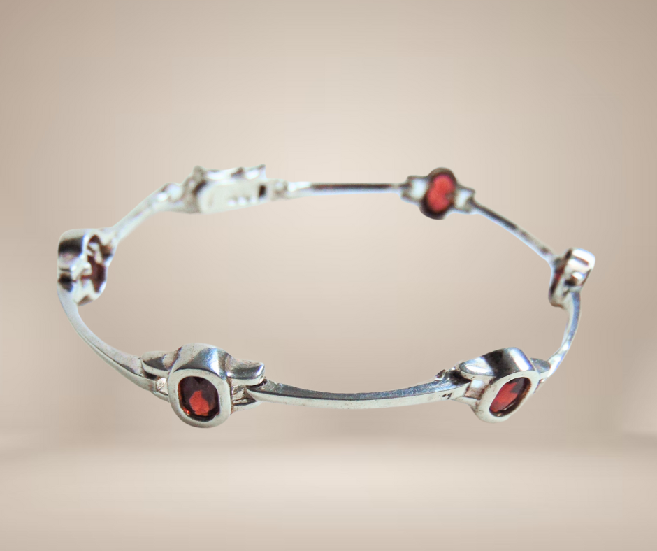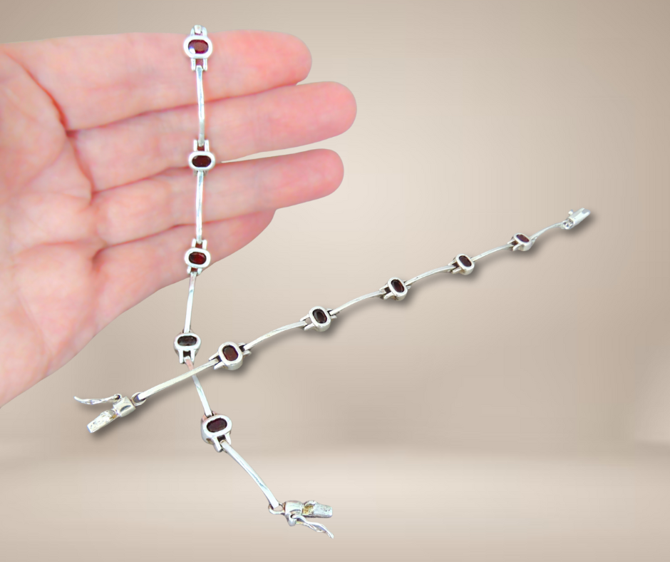 Mooie zilveren armband, gemerkt 925 en bestaand uit staafjes waartussen facet geslepen granaten zijn gezet. Hij heeft een tennisarmband sluiting met een extra veiligheidshaakje.