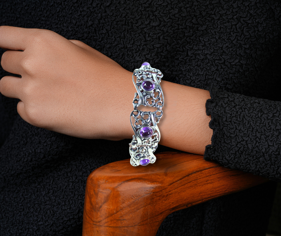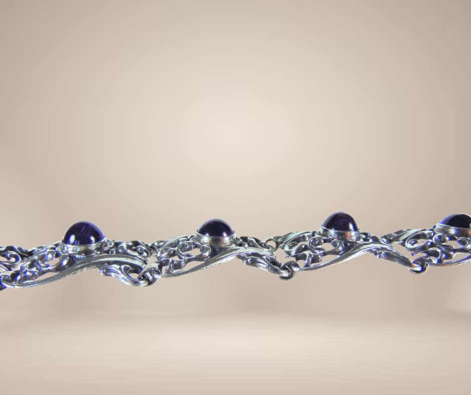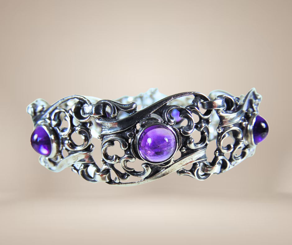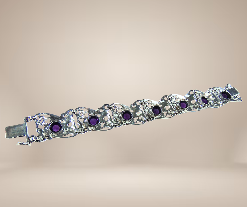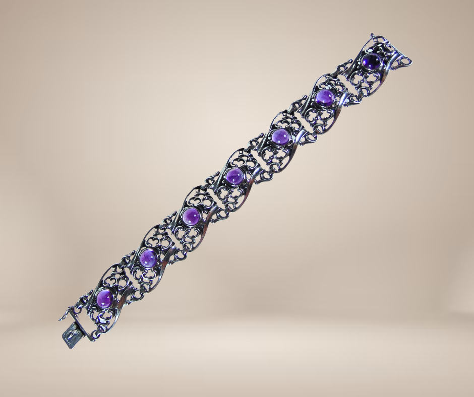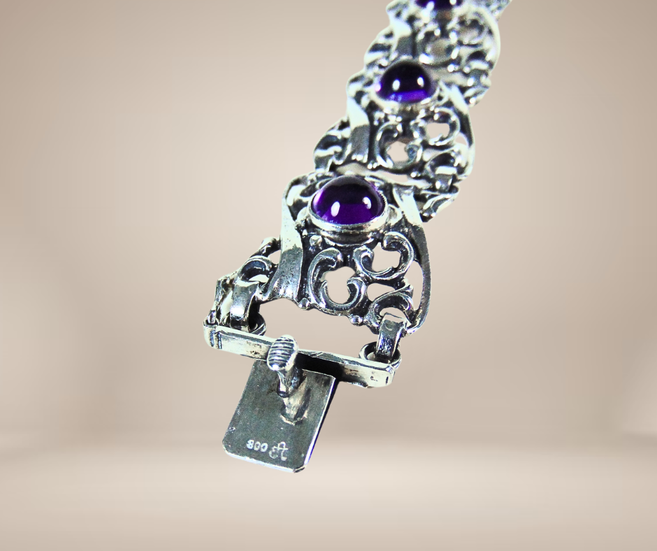 Dit is echt een briljant mooi exemplaar uit ca 1900, geheel gemaakt van sierlijke golvende ajour panelen, gezet met dieppaarse natuurlijke amethisten. De armband is naast het zilvergehalte ook gesigneerd met een monogram, ik heb helaas niet kunnen vinden wie dit is, maar het is vermoedelijk gemaakt in Duitsland. Naast het goedwerkende bakslot heeft hij een exta veiligheidssluitinkje.