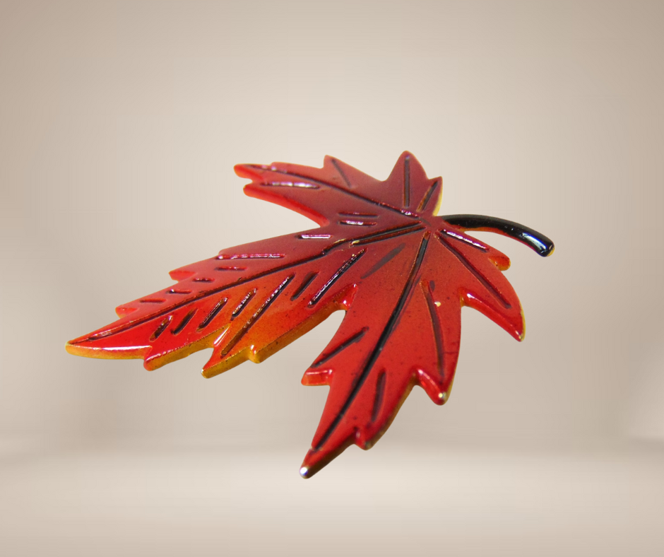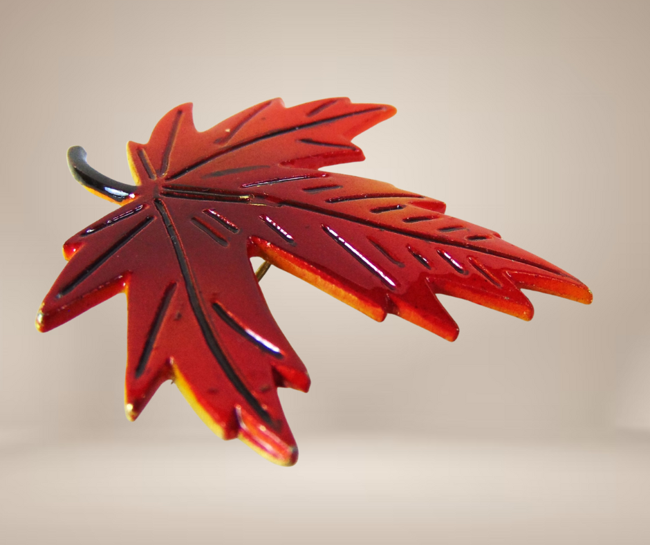 Prachtige vintage ‘60 rood emaille KOREA herfstblad broche