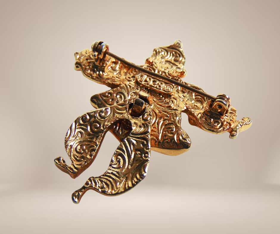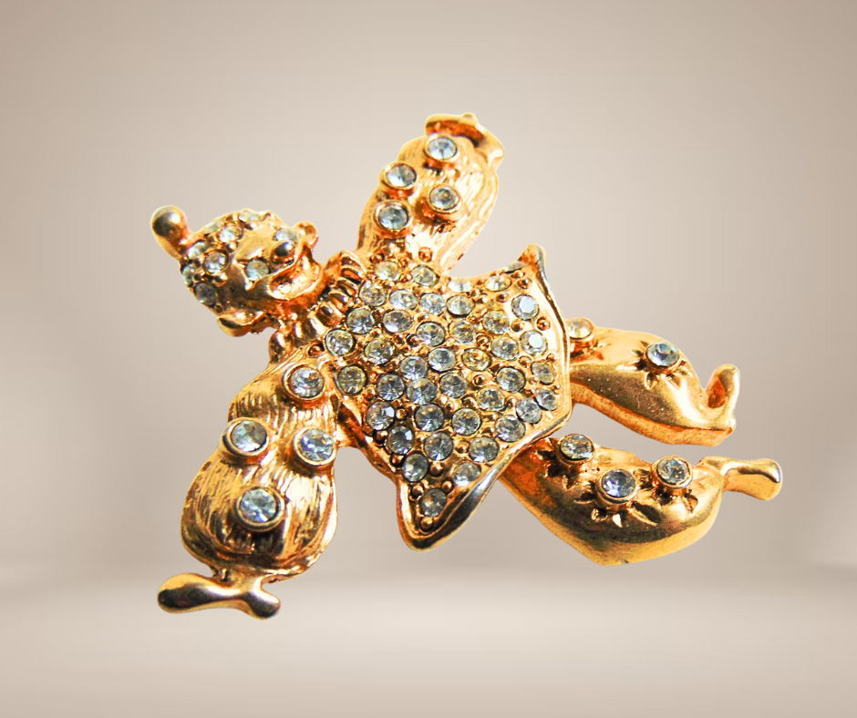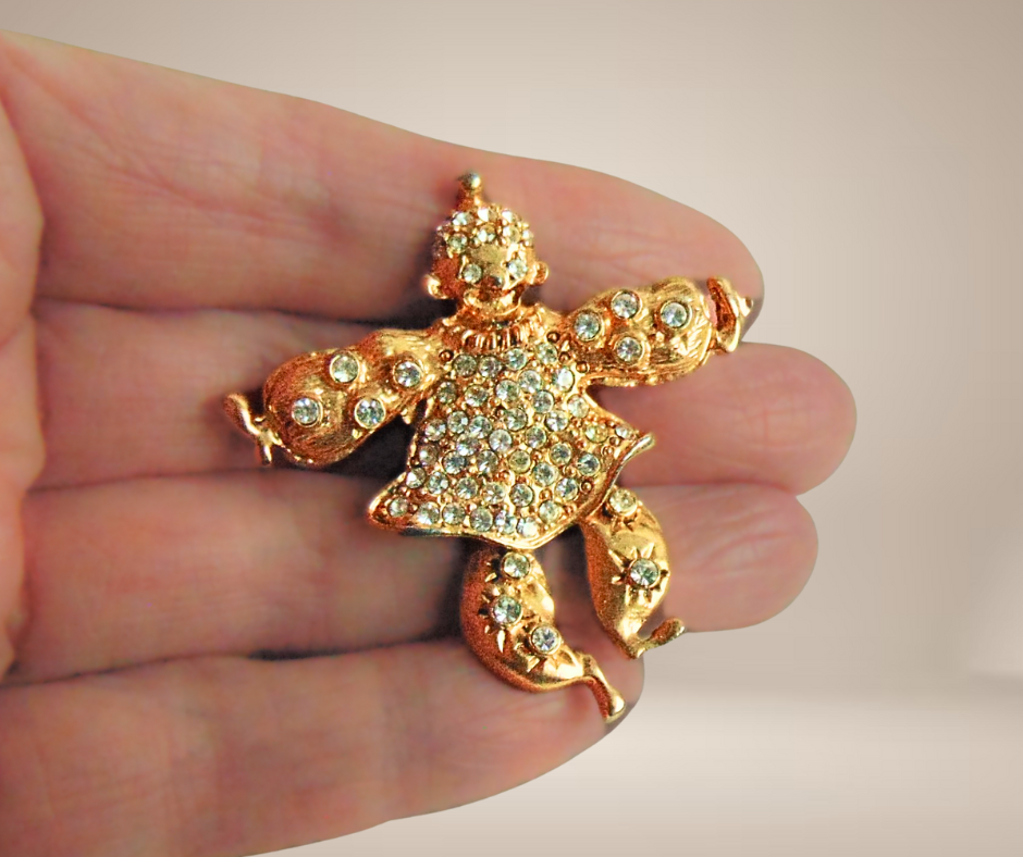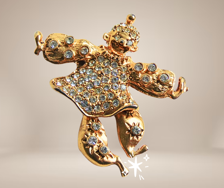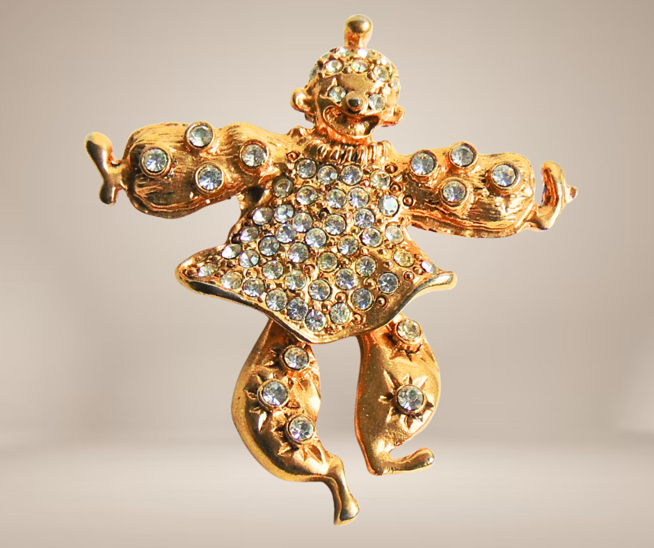 De 1928 Jewelry Company maakte deze mooie en grappige goudkleurige Clown broche in ca. 1980. De broche is bezaaid met strass (in het echt sprankelend wit) en het clowntje heeft los bungelende beentjes. De dubbele c-sluiting werkt perfect.