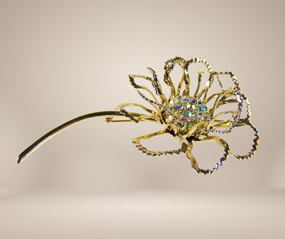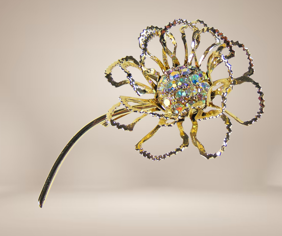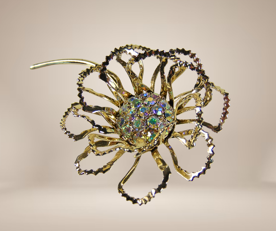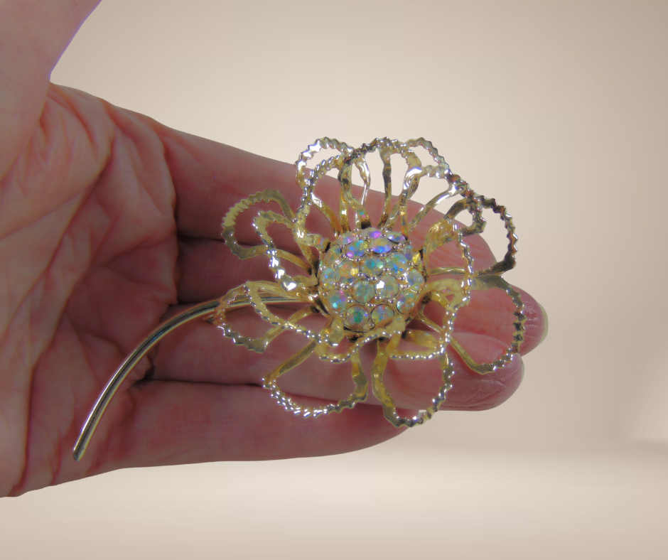 Grote vintage goudkleurige 3D bloem broche, in 1968 gemaakt door Sarah Coventry, the queen of sparkle! De broche is gezet met aurora borealis wat de broche een sprookjesachtige uitstraling geeft. Het bewegende gedeelte van de sluiting zit klem maar de speld is zeer stevig geplaatst waardoor het inhaken al voldoende is, daarom wel voor een schappelijke prijs.