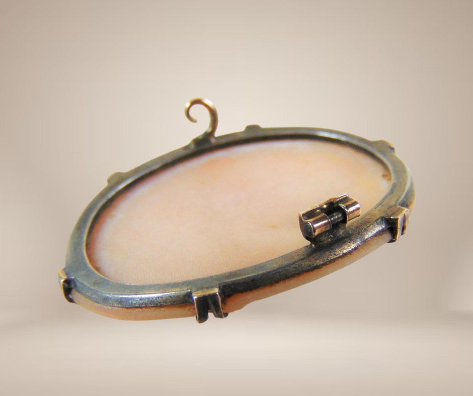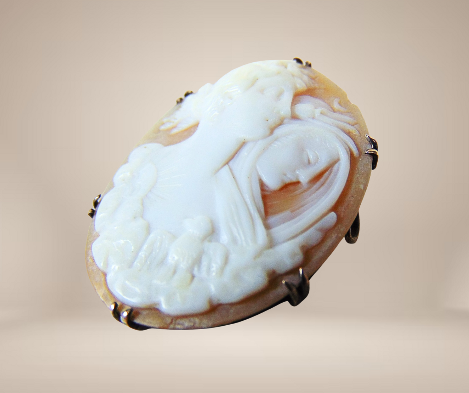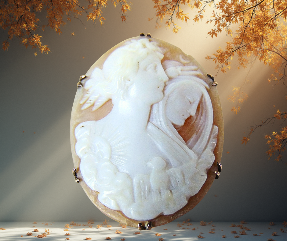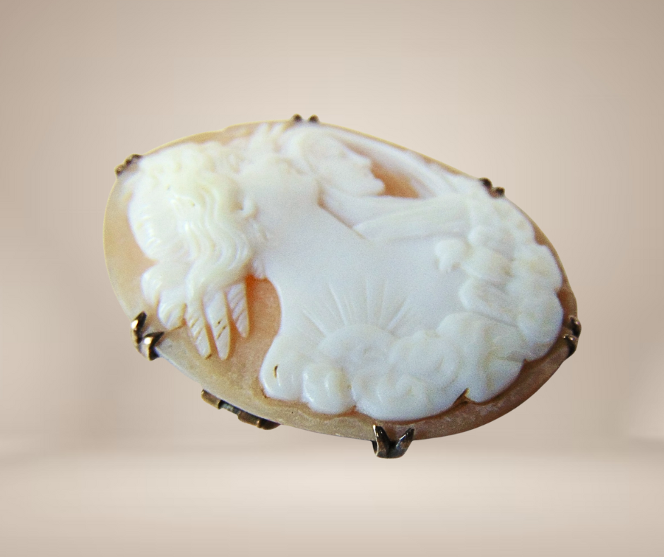 Let op: de speld ontbreekt! Deze schitterende handgesneden schelpcamee stamt uit eind 19de eeuw en laat het portret van Eos en Nyx zien, mythologische godinnen van de Dag en de Nacht.