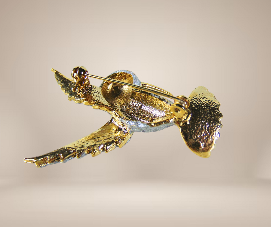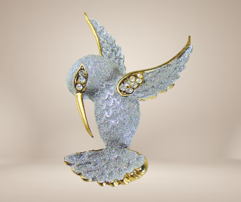 Mooie vintage broche in de vorm een kolibri in vlucht. De kolibri heeft een glimmend goudkleurige basis en accenten zoals de snavel en op de vleugels. Het lijfje en kopje is volledig bewerkt met zilverpoeder en de strass steentjes in de vleugel en het oogje maken het een perfect elegant geheel. Hij is gemerkt met een (waarschijnlijk) ontwerpnummer dat eindigt op 198 met nog een onleesbaar merk en hij heeft een goedwerkende speld.