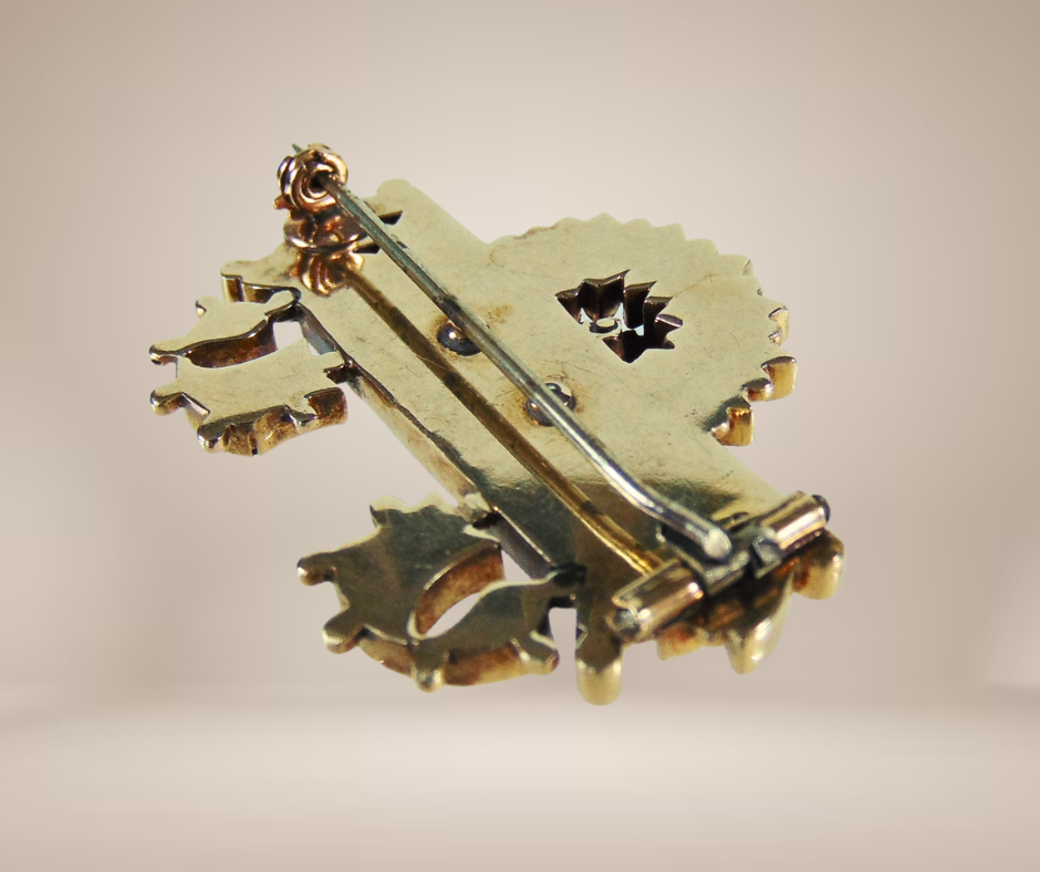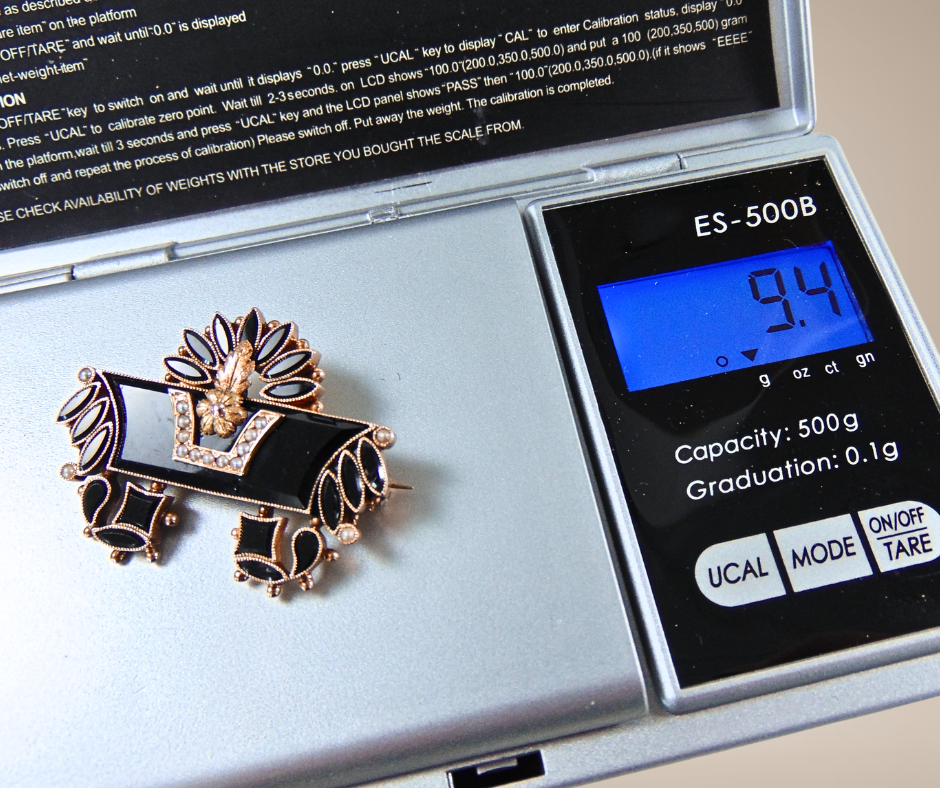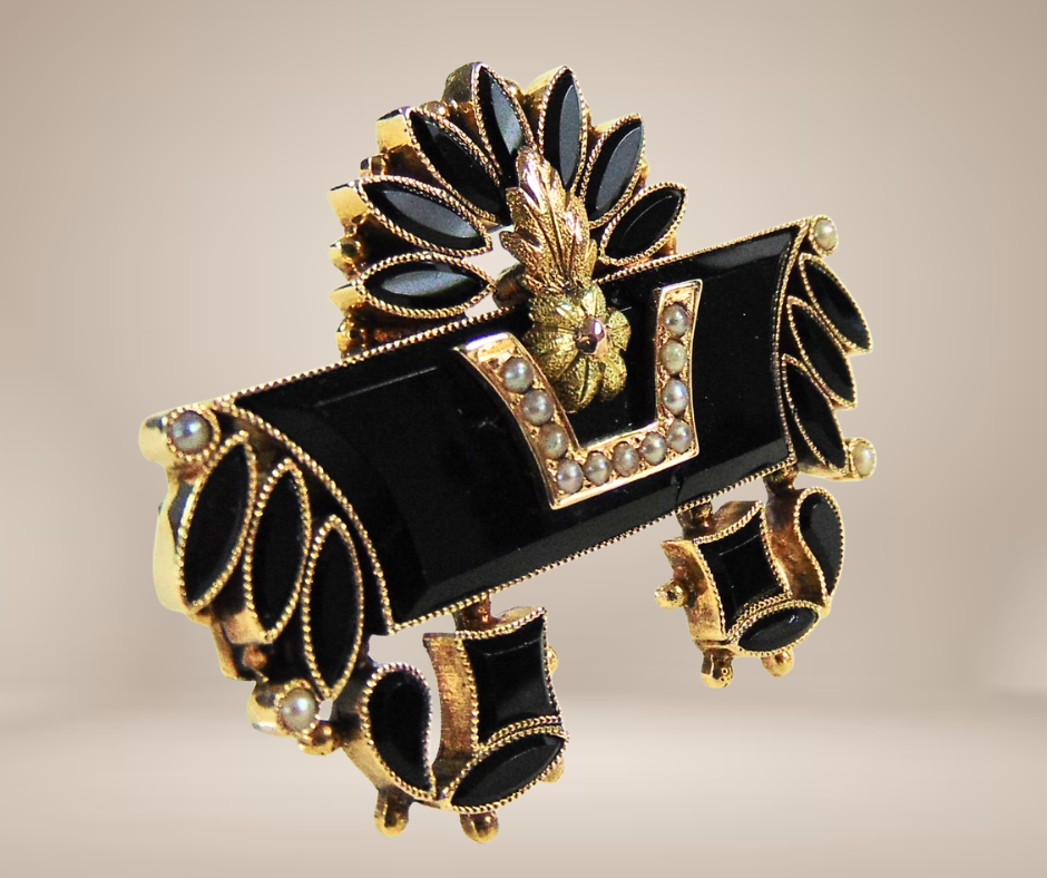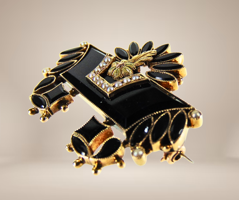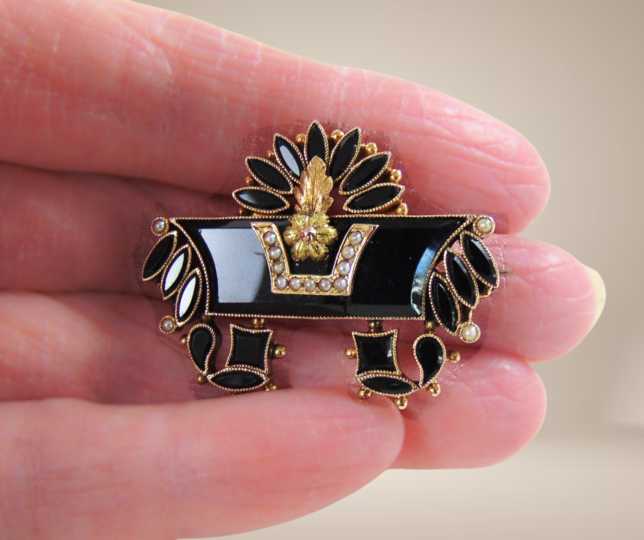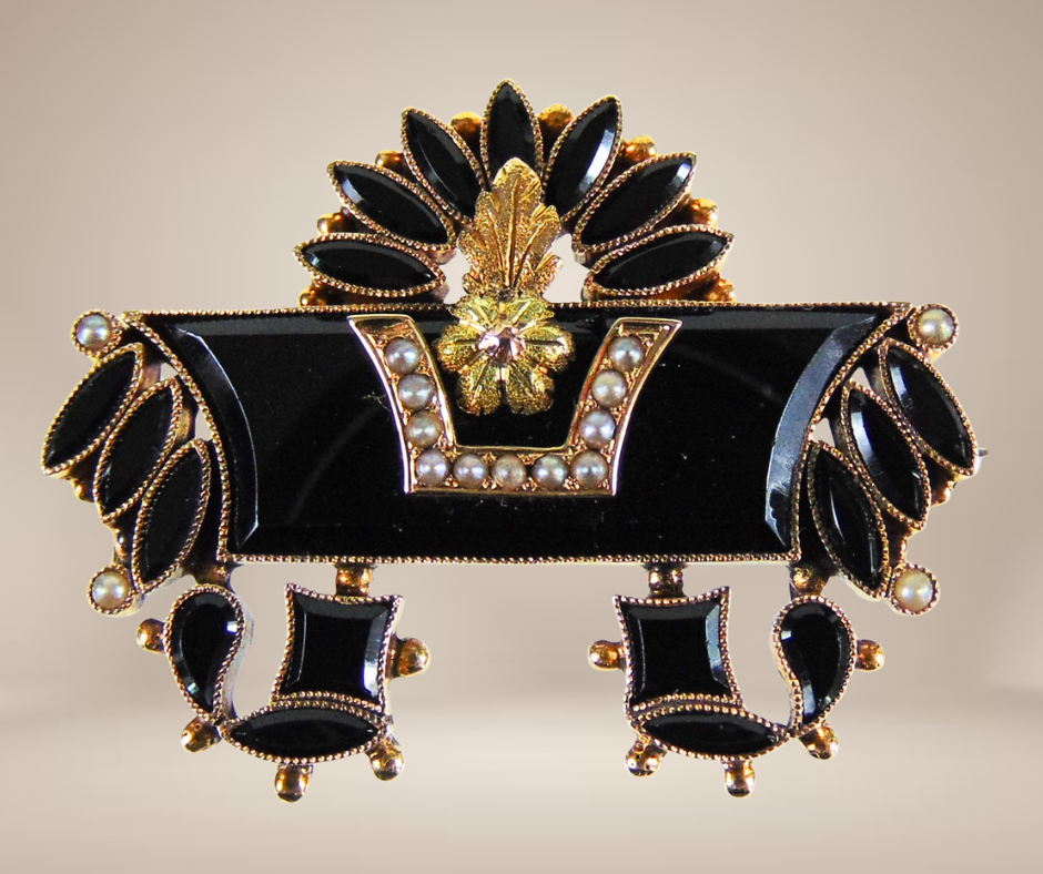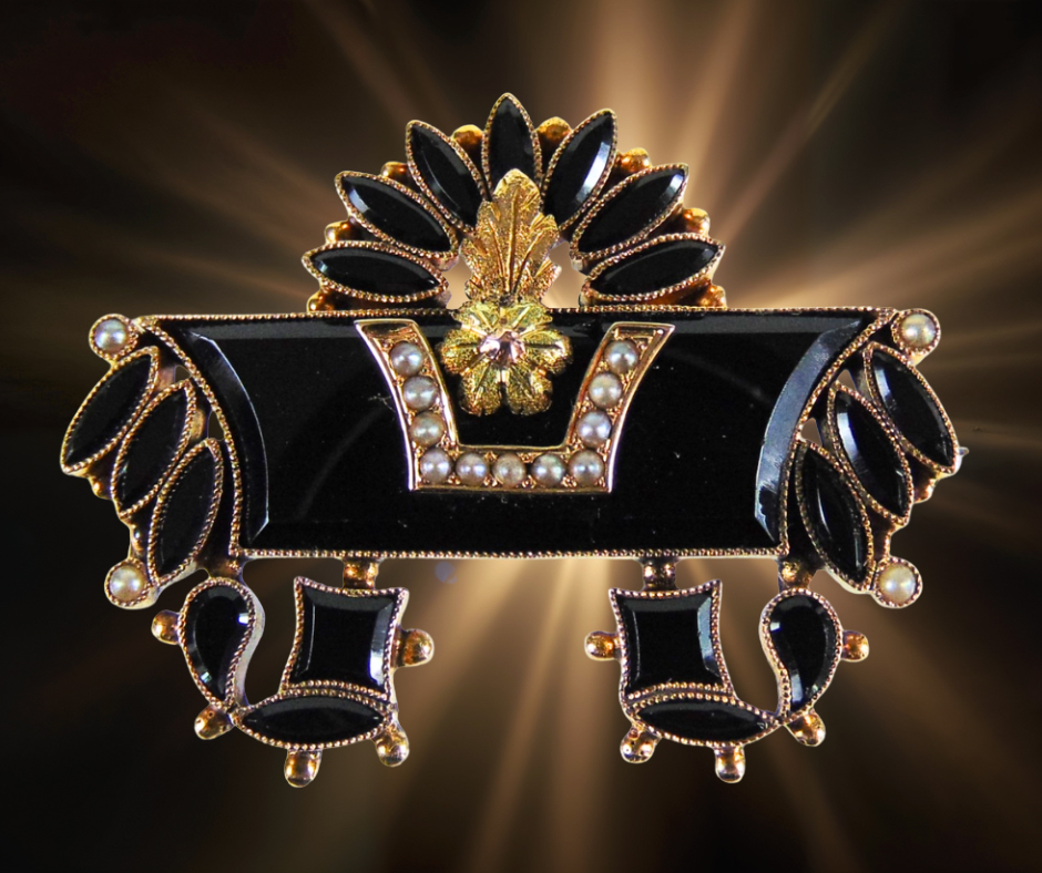 Sublieme antieke gouden broche uit de Victoriaanse periode (ca. 1860-1880), met een zeer fijn bewerkt design van waarschijnlijk facet geslepen git en bezet met kleine zaadpareltjes. De pareltjes staan symbool voor tranen van rouw en zijn geplaatst in een verfijnde railzetting, terwijl het git is gevat in prachtige gekartelde zettingen. Een indrukwekkend model van hoogwaardig goud, een zeldzaam stuk!