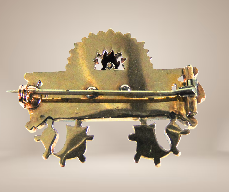 Staat: goed/normale gebruikssporen (speld onedel ooit vervangen, krasjes klein breukje git)