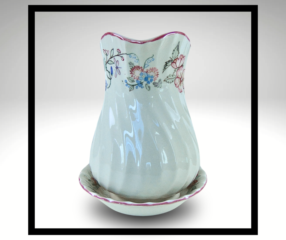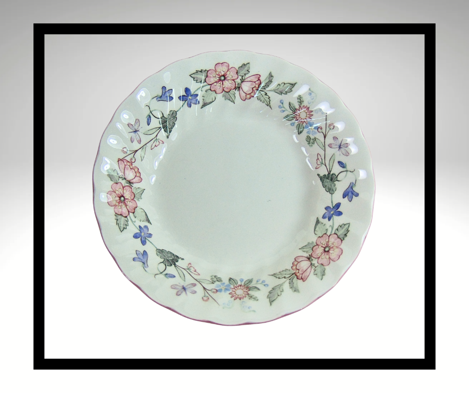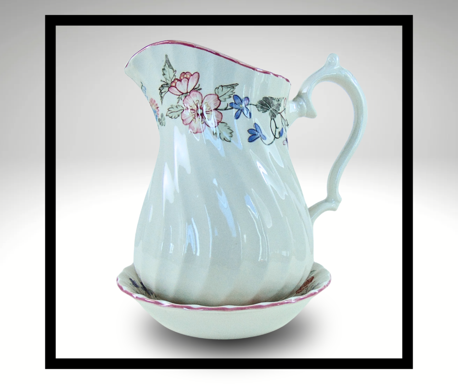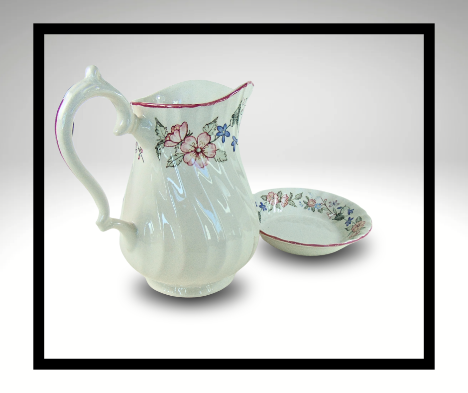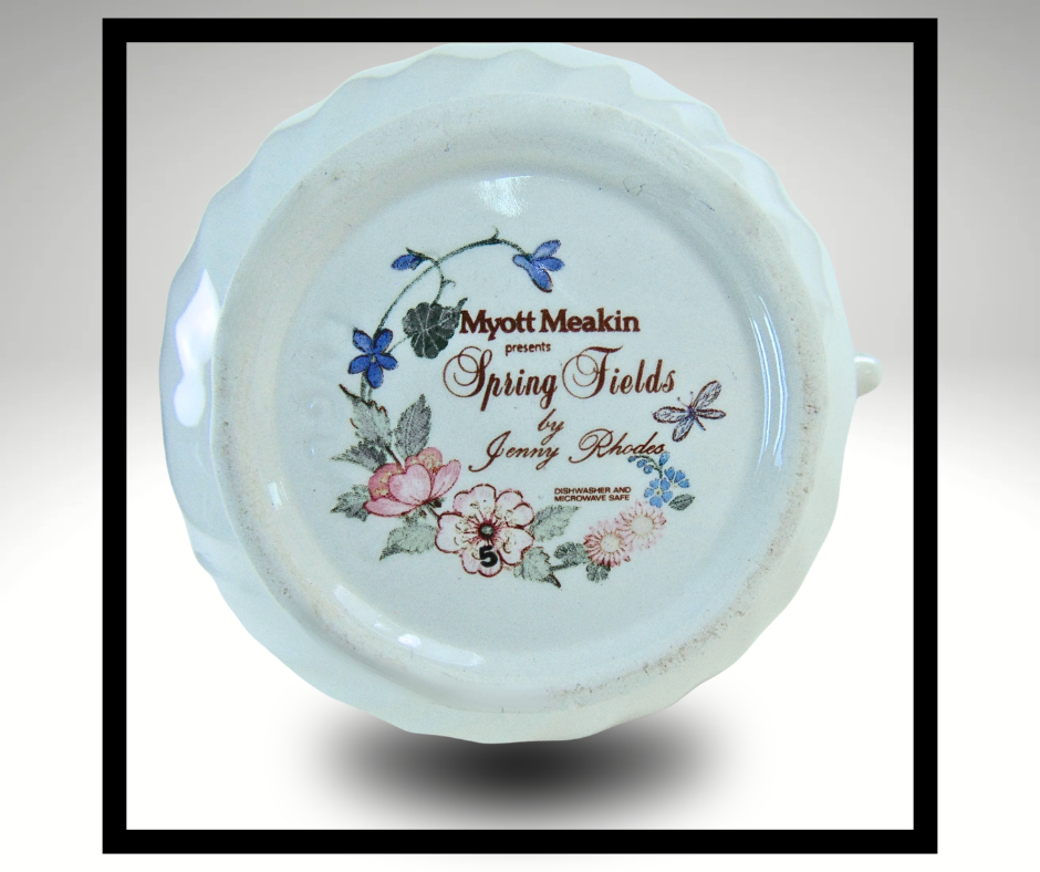 Van dit zeldzame en romantische "Spring Fields" sierstel van Jenny Rhodes uit de jaren 80 wordt elke liefhebber van Engels servies blij. De set bestaat uit een charmant sierlijk kannetje met bijbehorende diepe onderschotel en verkeert in een prachtige staat. De pastelkleurige bloemen en de karakteristieke geschulpte randen maken het een echte blikvanger in de servieskast of op een kaptafel of maak een feest van je zomerse lunch met deze kan als jus d’orange kan.