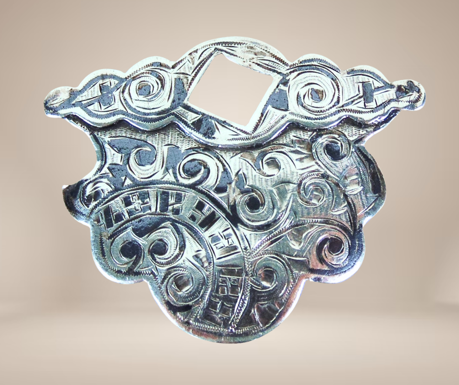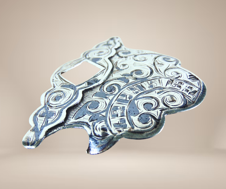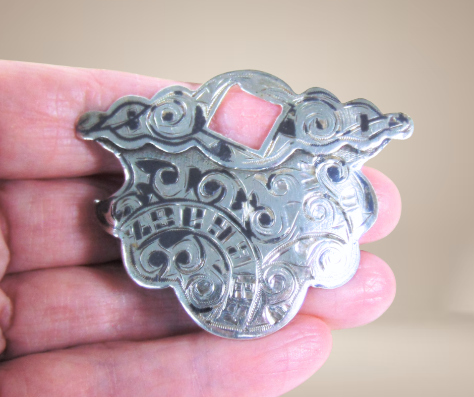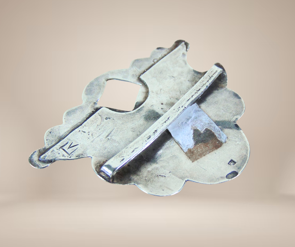 Supercool deze antieke zilveren gedeeltelijke riem gesp, tussen 1899-1908 gemaakt door de Russische edelsmid Aleksandr Kazimirovic Vyrzhikovsky. De gesp is in zwart niello emaille gegraveerd en het vierkante gat werd gebruikt om met een (meestal) zwaardvormige wig aan te sluiten op het andere deel. Je zou hem als hanger kunnen gebruiken of gewoon als kunstobject bewonderen.