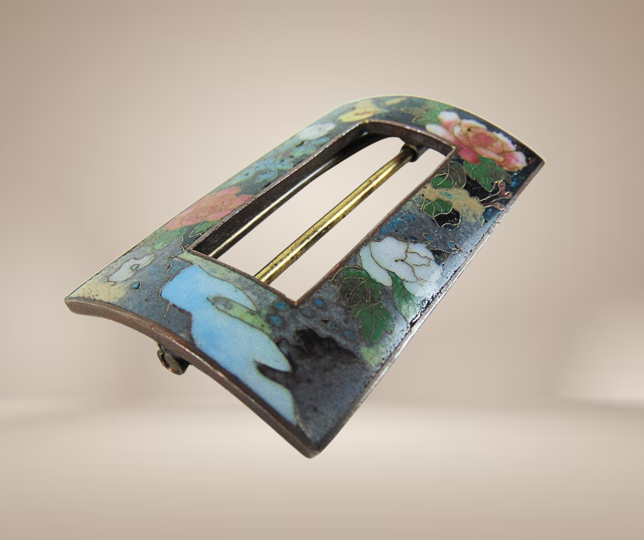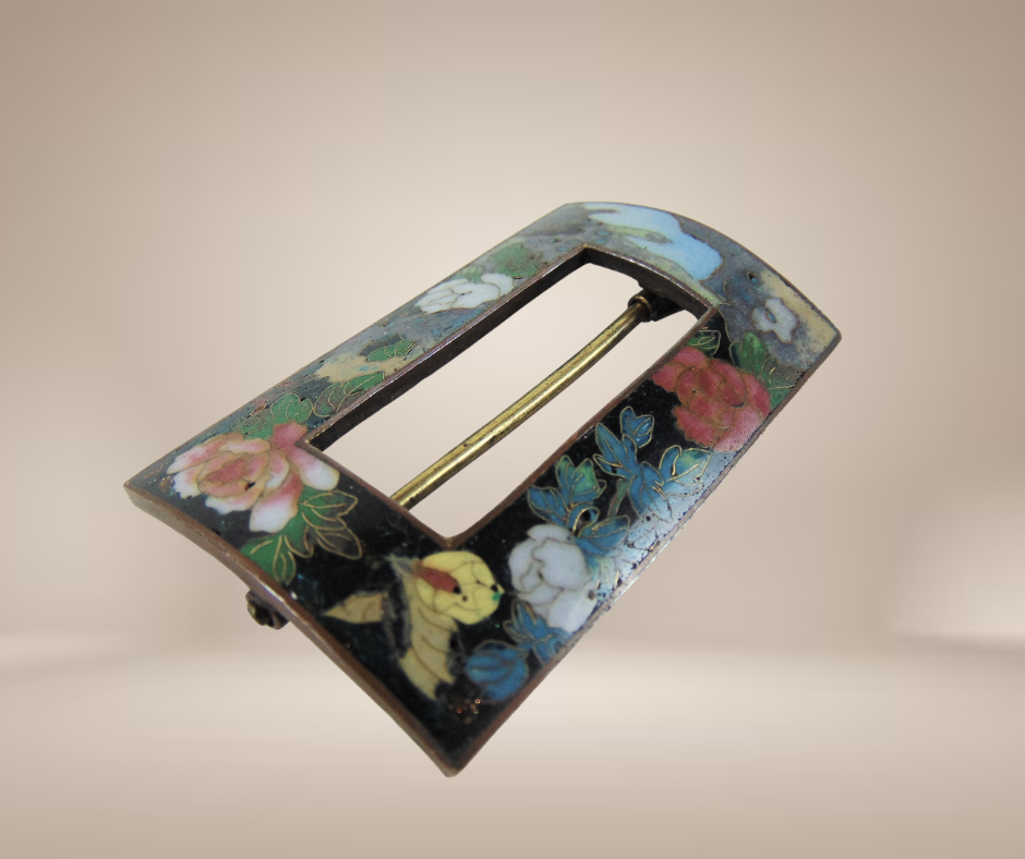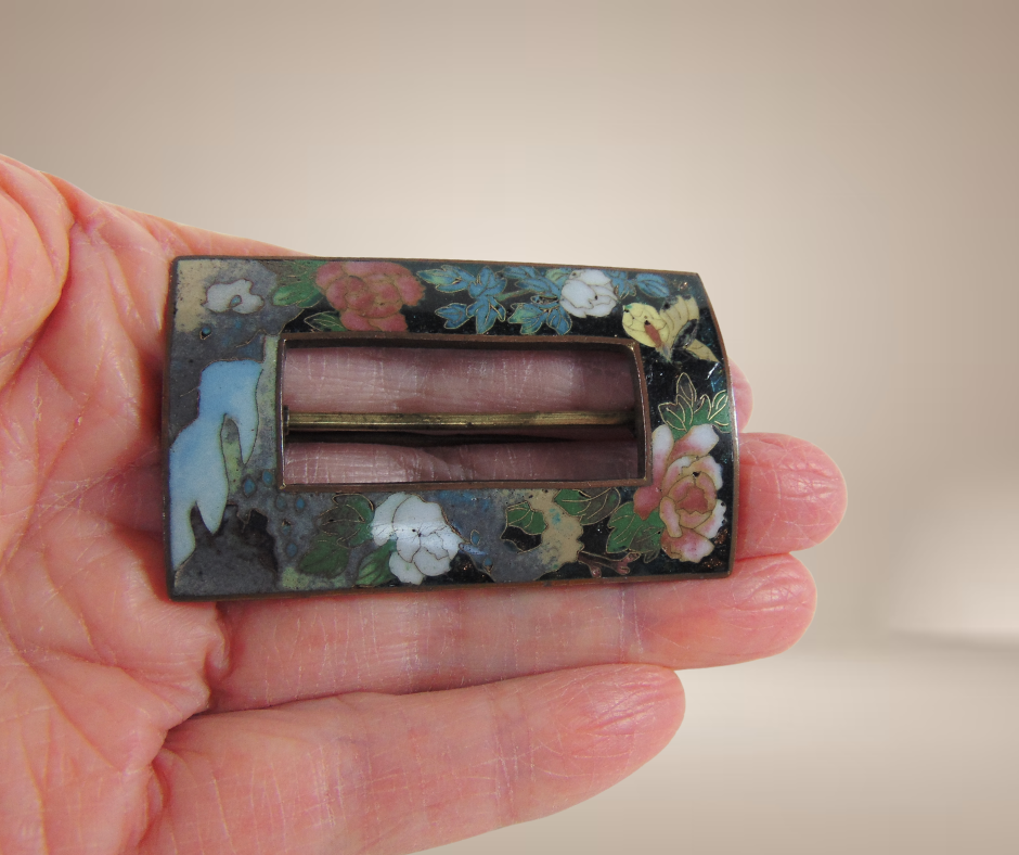 Schitterende antieke gesp uit eind 19e of vroeg 20e eeuw, Japans ontwerp met bloemmotieven in fijn cloisonné-email op koper. De warme donkere achtergrond laat de zachte kleuren van het email schitteren, met een ingetogen glans die typerend is voor het verfijnde handwerk uit de Meiji-periode. Mooie detail: ook de achterzijde van de gesp is groen geëmailleerd. Een decoratieve schuifgesp, bedoeld voor een ceintuur, nog in prachtige staat.