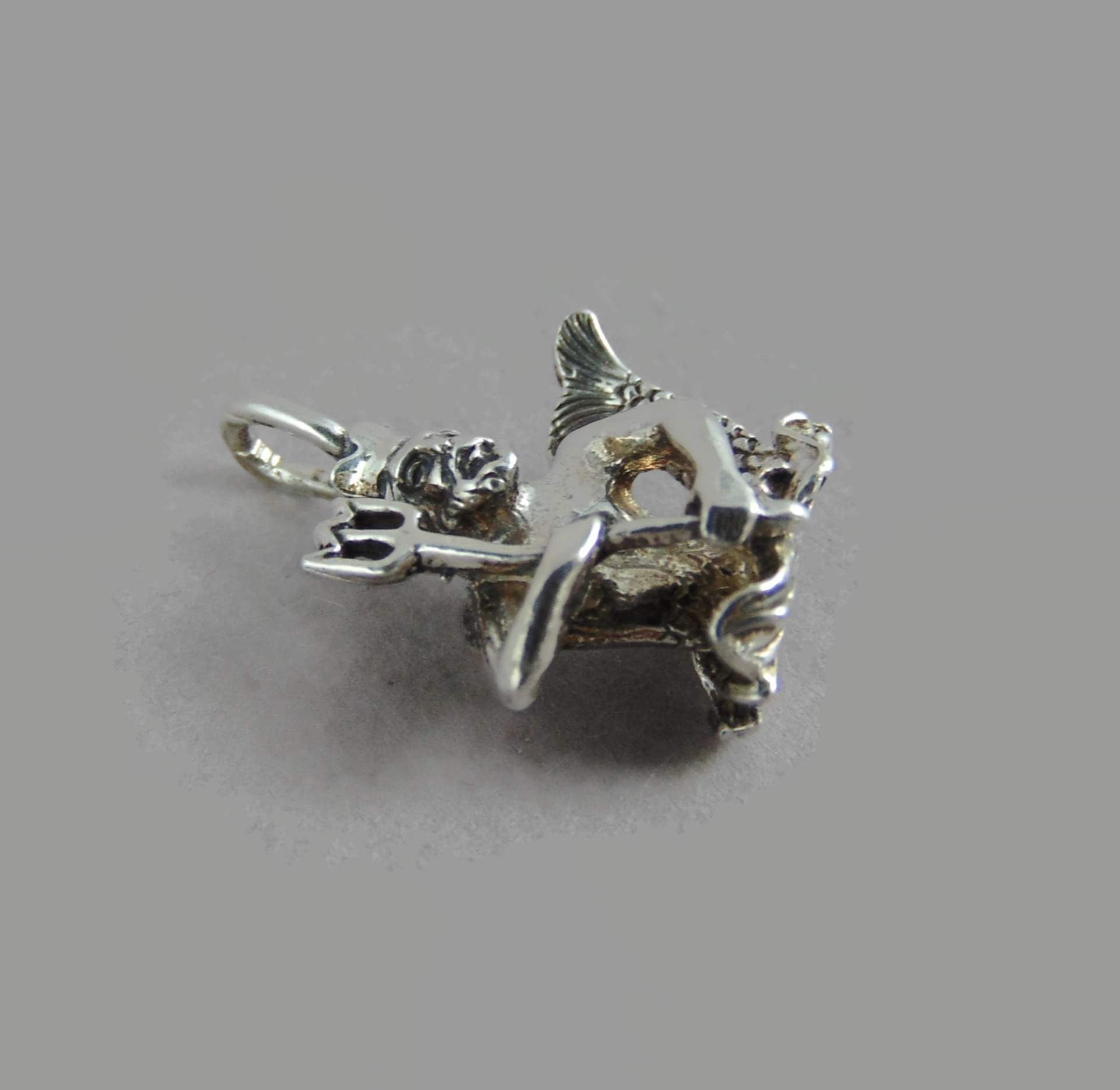 Gave zilveren 3D hanger, gemerkt 835 voor het 2de gehalte zilver en een makersmerk dat ik helaas niet goed kan lezen. In de Griekse mythologie was Poseidon een zoon van de Titanen (reuzen) Kronos en Rheia en de broer van oppergod Zeus. Poseidon (Neptunus bij de Romeinen) had een drietand als attribuut. Hiermee kon de onstuimige god water in beroering brengen en rotsen doen splijten. De hanger is zeer gedetailleerd, zelfs de golven zijn onder zijn staart aangegeven.