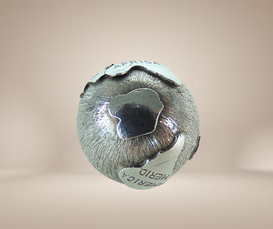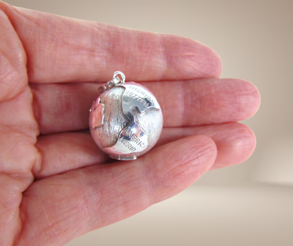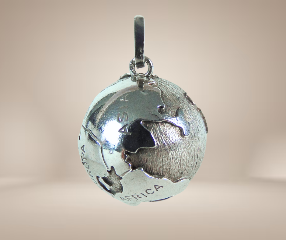 Deze prachtige grote modernistische design hanger heeft de vorm van een wereldbol met verhoogde continentvormen en gravures die de continenten aanduiden. Het feit dat Noord- en Zuid-Amerika in het Latijn zijn geschreven maakt hem extra speciaal en uniek. Het continent Australië is niet gegraveerd. Wat ook prettig is, de bol is rondom geciseleerd wat het heel fijn maakt om hem te strelen, het voelt bijna satijnachtig. De bol is naast het zilverkeur ook gesigneerd, helaas kan ik dit niet ontcijferen dus blijft de maker onvindbaar.