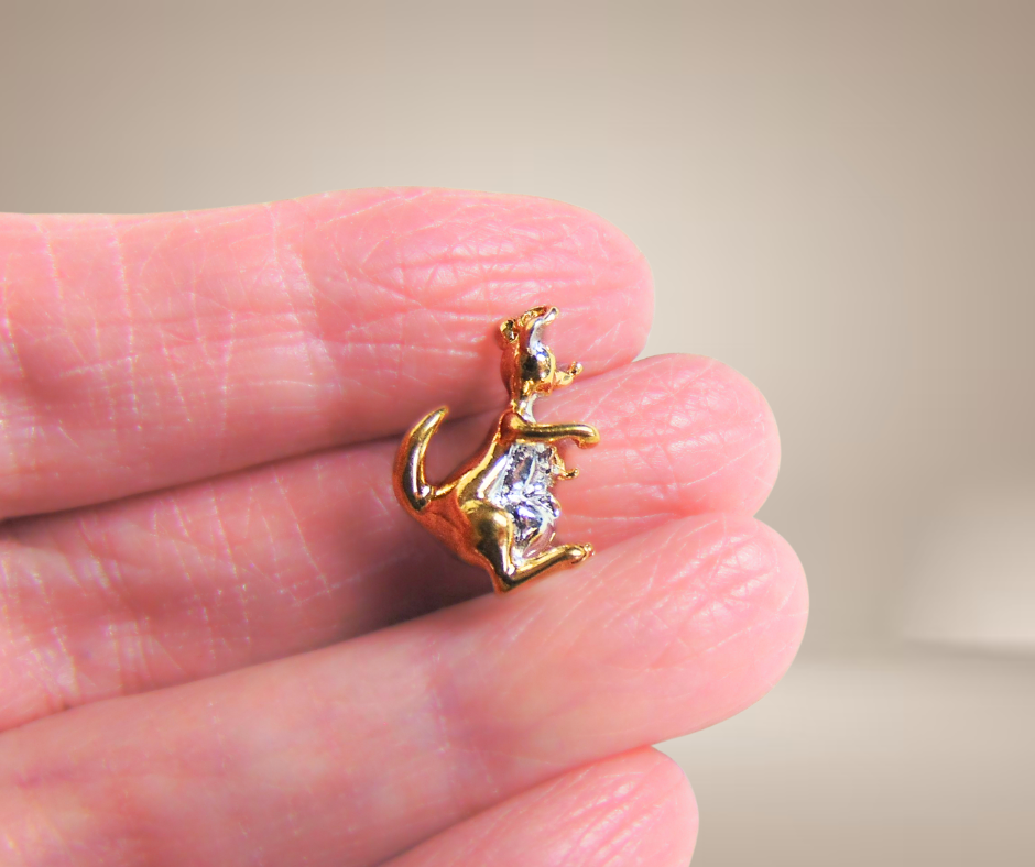 Supergrappige geel en witgoud vergulde bedel in de vorm van een kangoeroe met een jong in haar buidel.