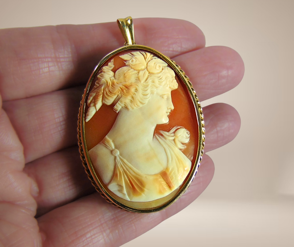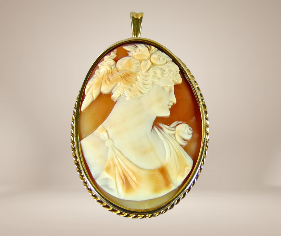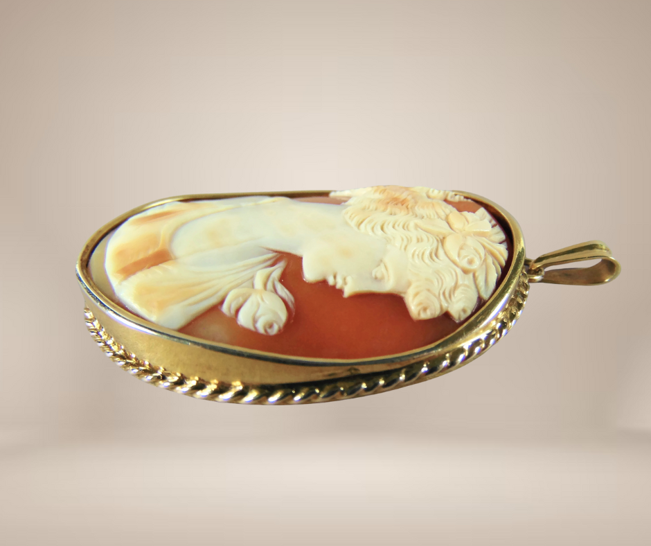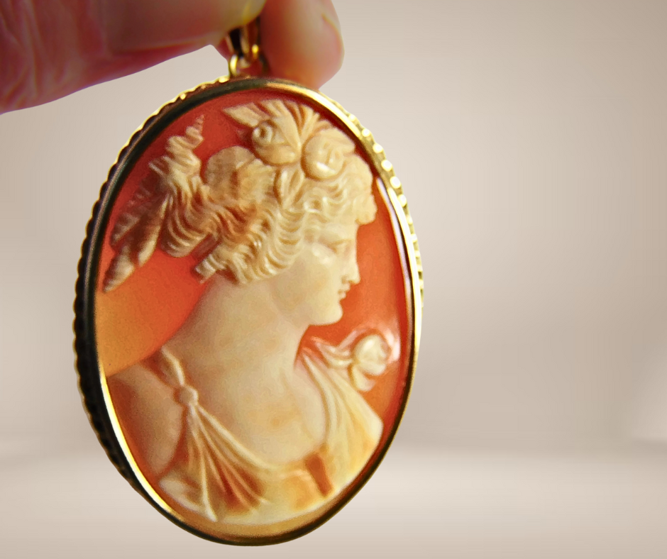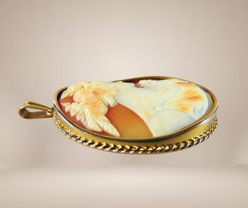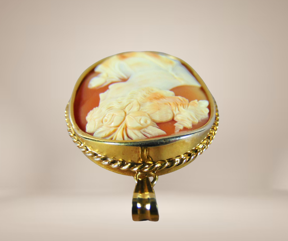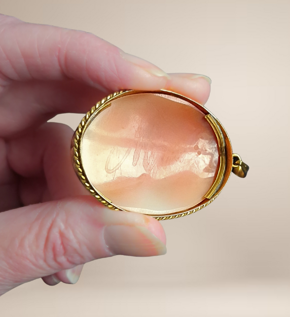 Deze prachtige schelpcamee uit ca 1920 is hoogstwaarschijnlijk in Italië vervaardigd en hij is op de achterkant gesigneerd, maar helaas is de signatuur niet goed te lezen.