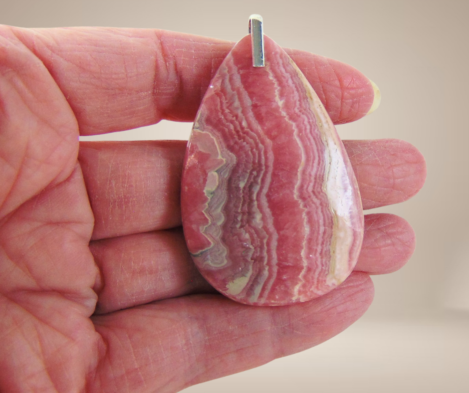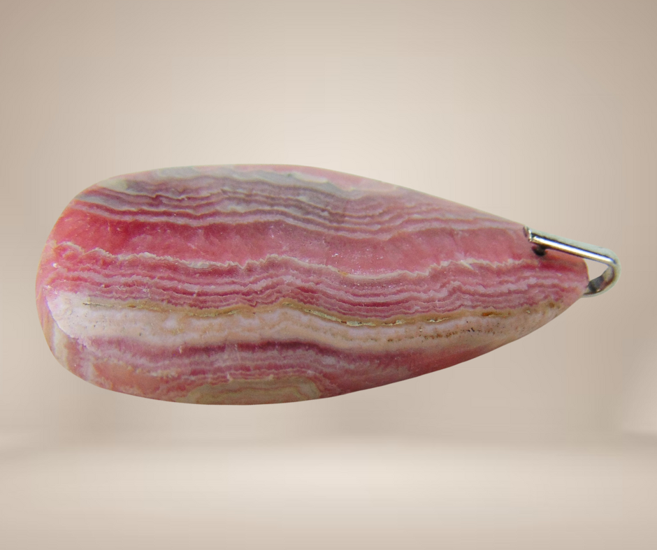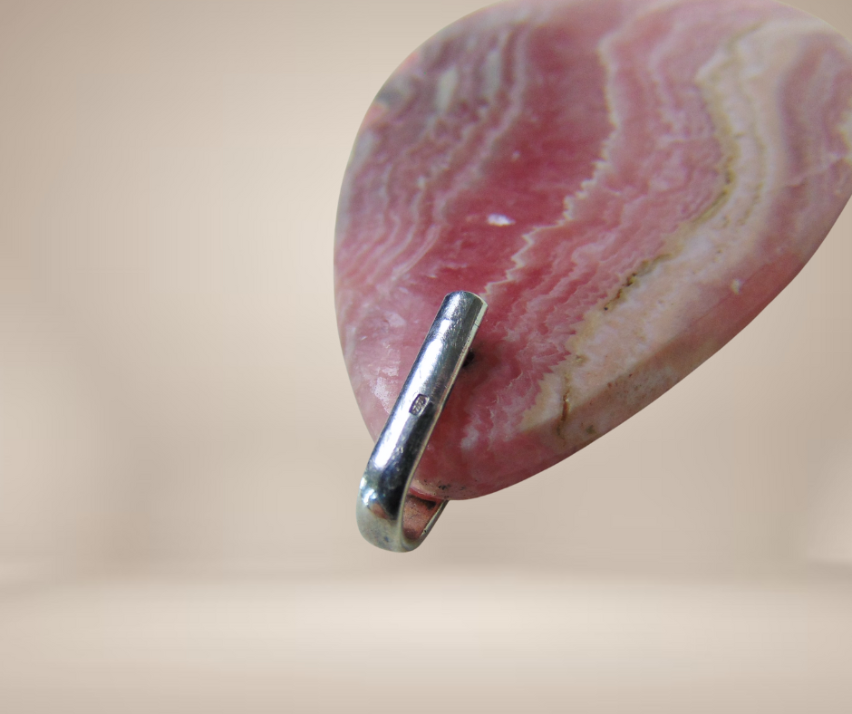 Supermooie grote en zware edelsteen druppel hanger, natuurlijke rhodochrosiet met een strak zilveren oog.
