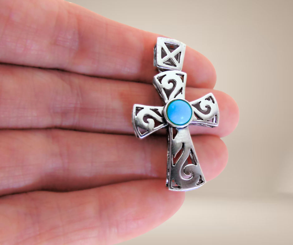 Prachtige grote zilveren kruis hanger, helemaal opengewerkt met sierlijke krullen en hij is gezet met een synthetische turquoise cabochon.