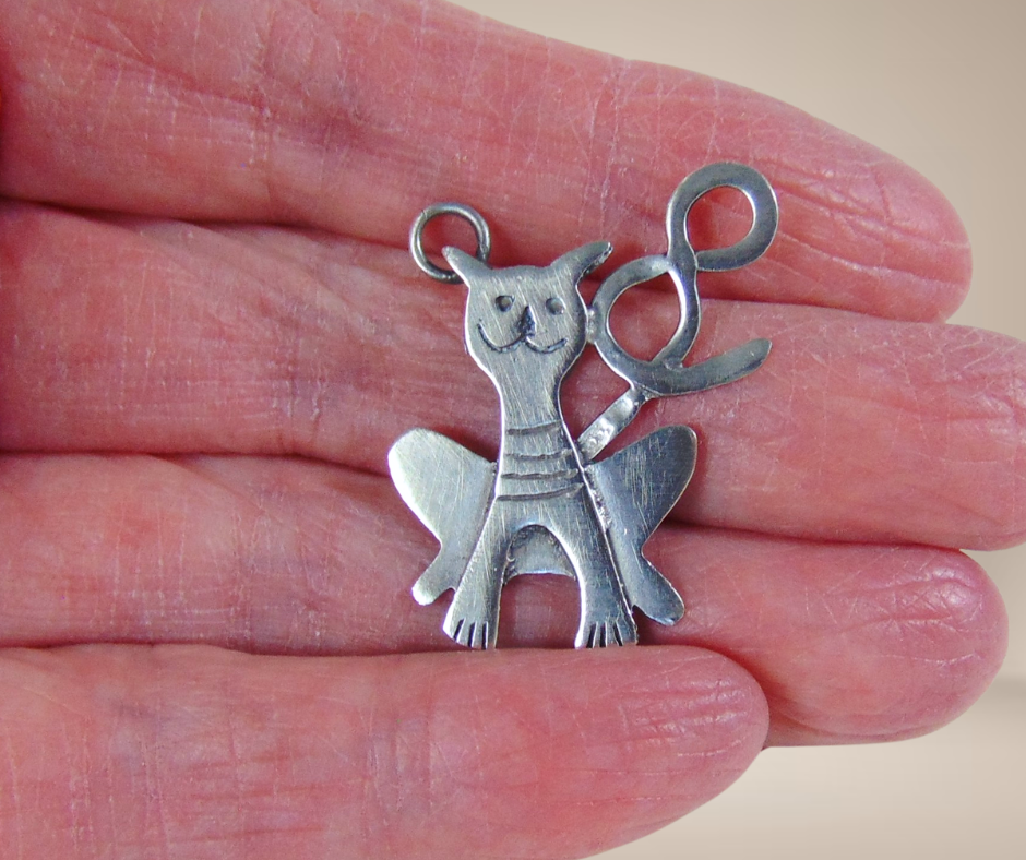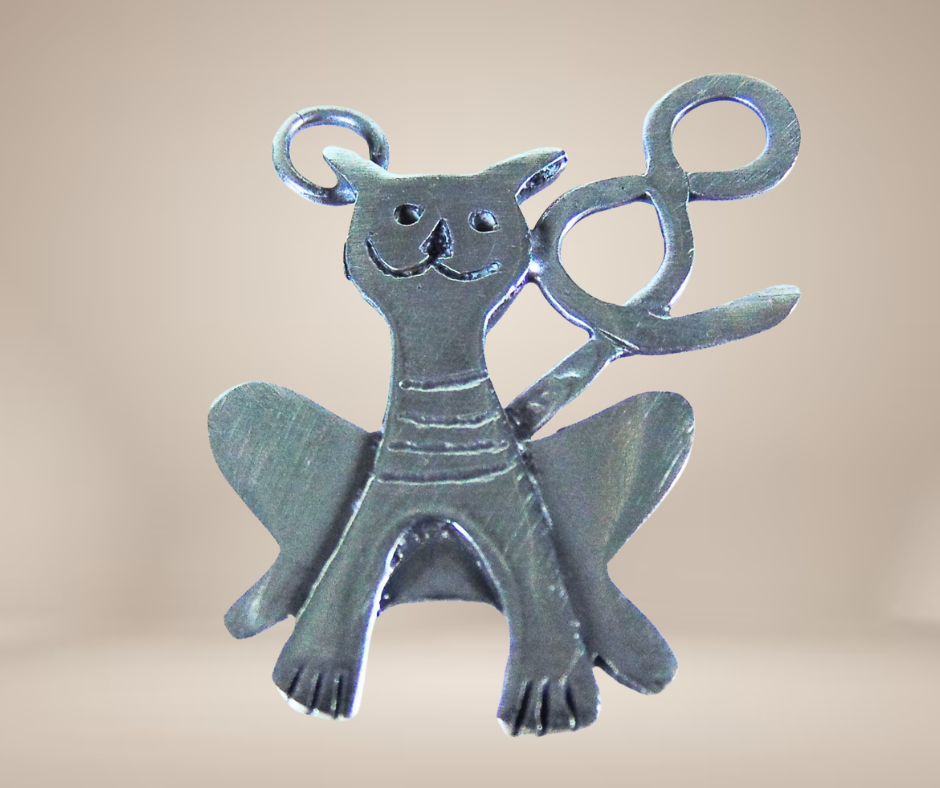 Grappige zilveren modernistische kat hanger, met de hand gemaakt door een designer met het merk RXN, ik heb helaas niet kunnen vinden wie dit is. Het is dus een uniek handgemaakt exemplaar waar je elke dag weer vrolijk van wordt.