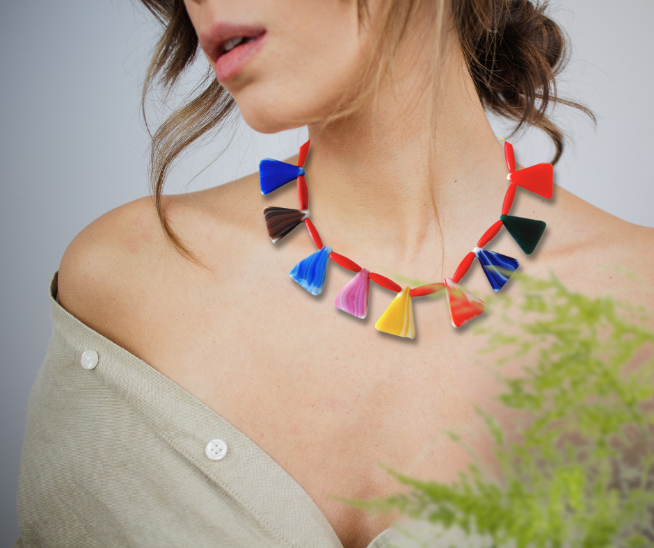 Deze schitterende vintage ketting is met de hand gemaakt in Mali door de Fulani vrouwen in ca 1950. Deze prachtige kleurrijke kralen zijn gemaakt van gesmolten glas in driehoeken en ellipsen. Oorspronkelijk zijn deze kralen gemaakt in Bohemen rond 1900, nu de Tsjechische Republiek en deze werden naar Afrika meegenomen als handelskralen. Ze worden ook Fulani wedding beads genoemd of Mali wedding beads omdat deze werden geschonken aan jonge vrouwen op hun trouwdag. Vooral de driehoekige en elliptische vormen zijn inmiddels zeer zeldzaam en helemaal in deze zeer goede conditie. De ketting heeft een zilverkleurige toggle sluiting.