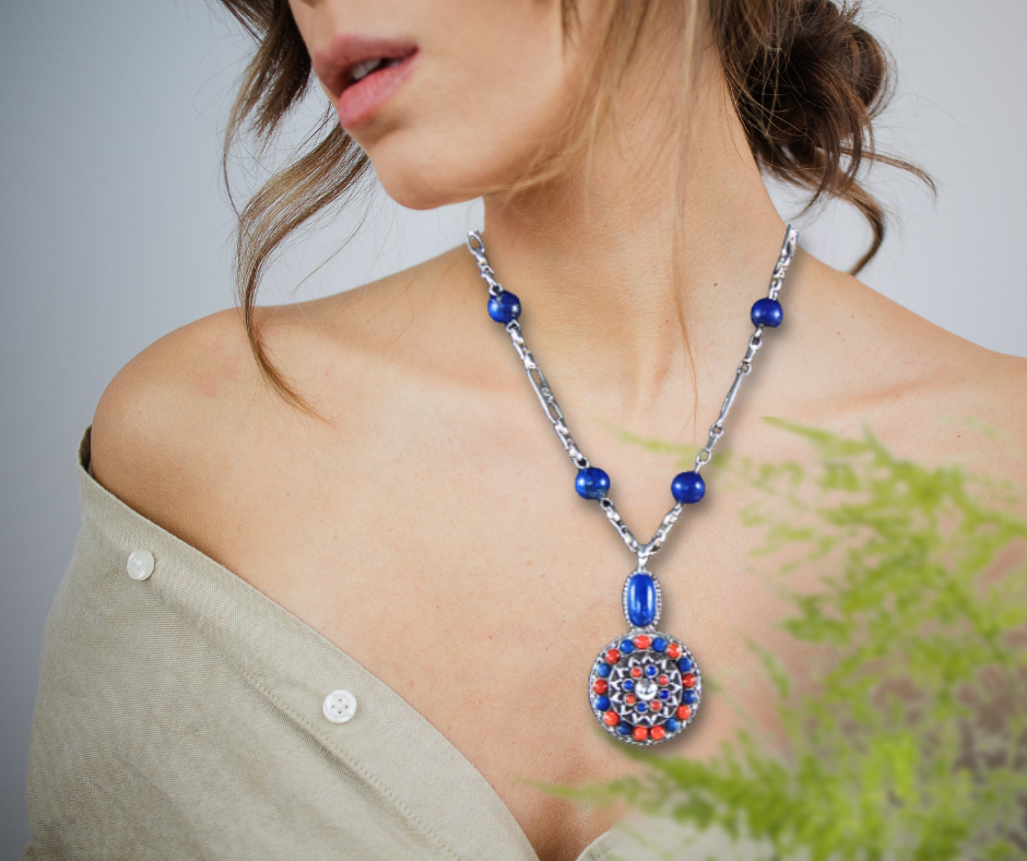 Wat een fantastische ketting is dit! Gemaakt van zwaar zilveren zeer aparte unieke schakels, afgewisseld met grote natuurlijke Lapis Lazuli kralen. Hieraan hangt een grote en zwaar zilveren cluster hanger met Lapis Lazuli en koraal gezet in een prachtige stervorm. De ketting is gemaakt in Arezzo, Italië door Pietro Sorini & Casi Ilario. Hij heeft een geïntegreerde haaksluiting. Het geheel weegt maar liefst 69 gram en geeft elke outfit die extra OEMPF!