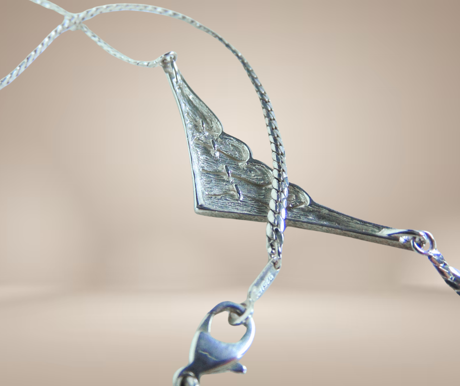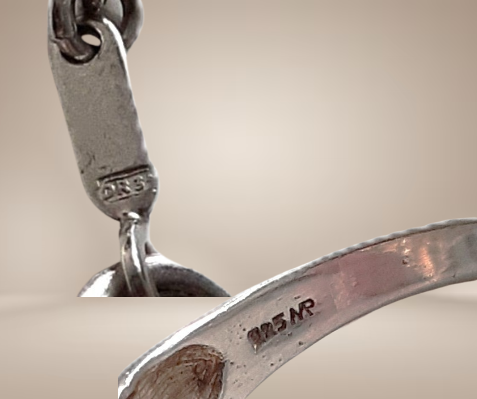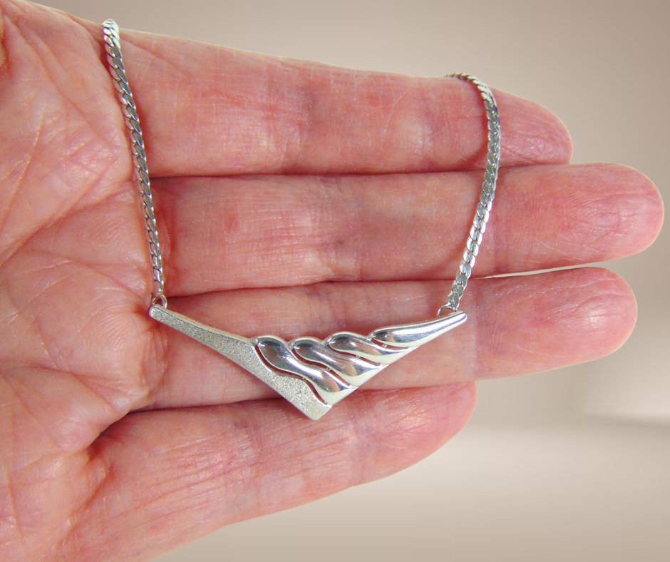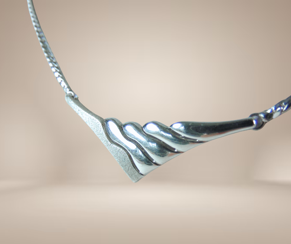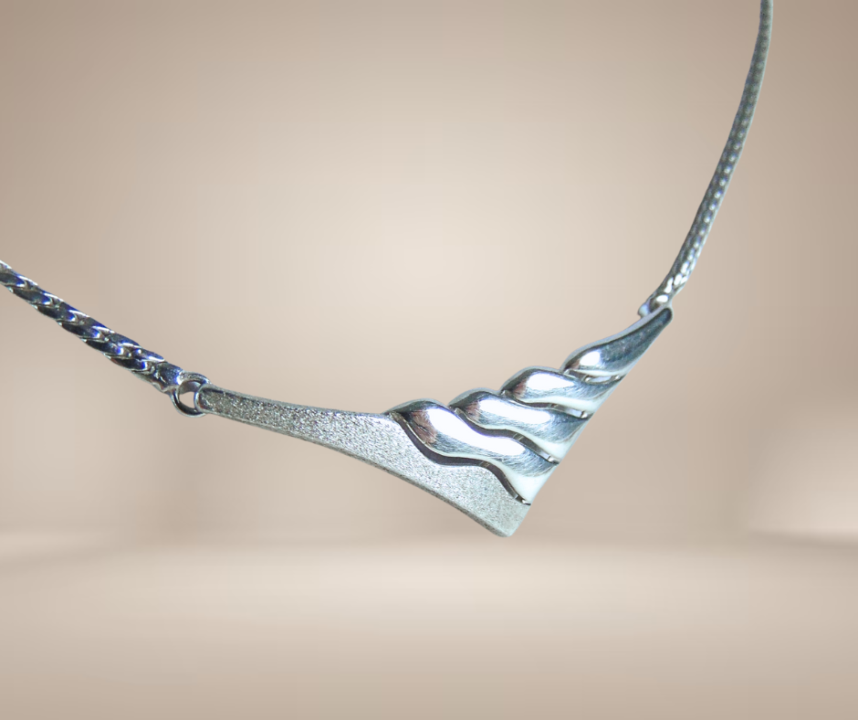 Schitterende zilveren modernistische design ketting met vaste hanger van Pforzheim designers Moser & Pfeil, welke al 100 jaar sieraden maken. De ketting is in een V vormgegeven met glanzend zilveren golven met een matzilveren contrasterend deel. Een unieke kans én wat het nog zeldzamer maakt is dat wij ook een bijbehorende ring aanbieden.