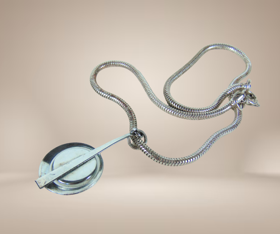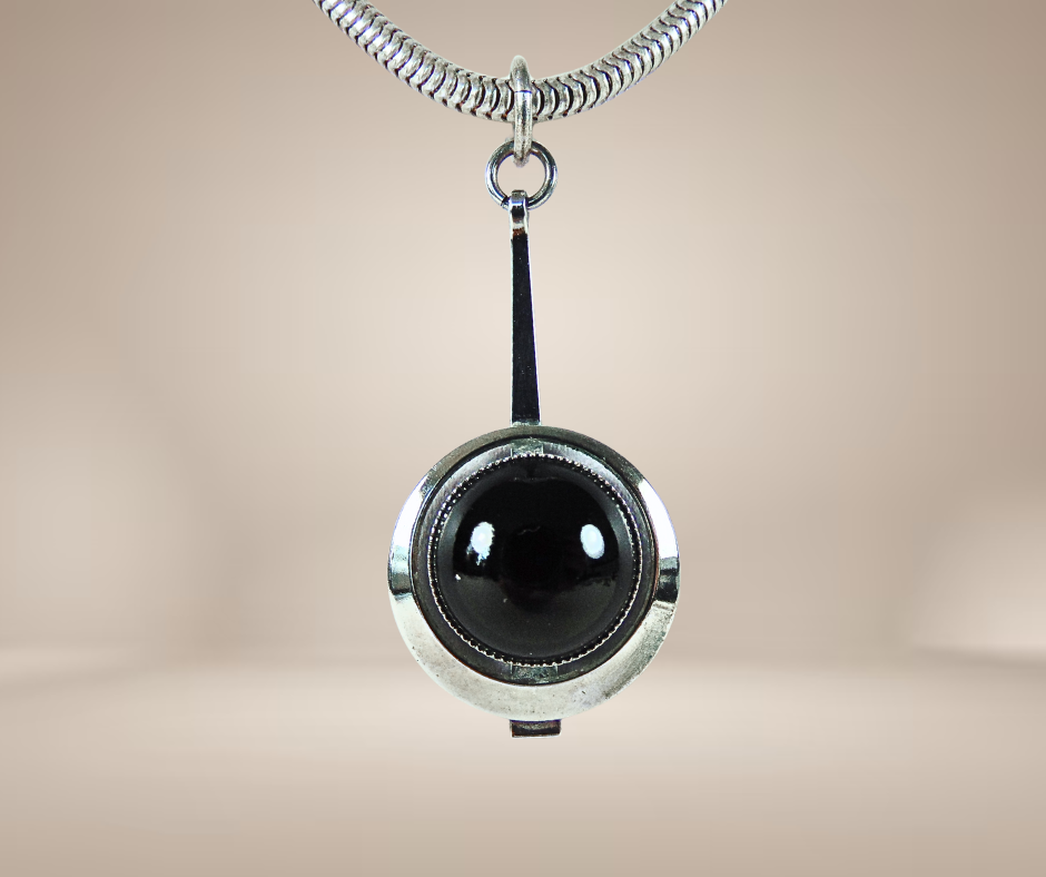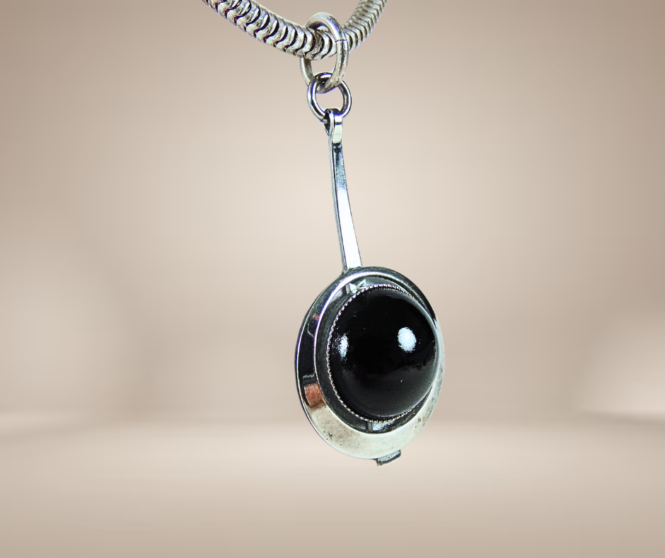 Mooie ketting met een strakke modernistische hanger met een grote zwarte glazen cabochon. De ketting is een dikke slangschakelketting.
