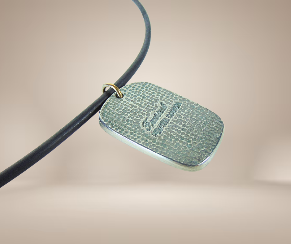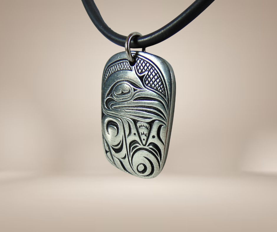 Supergave stoere hanger van het merk Frederick uit Canada, gemaakt van tin (pewter) met de tribal afbeelding van een raaf. Hij wordt geleverd aan deze bijbehorende rubberen ketting.