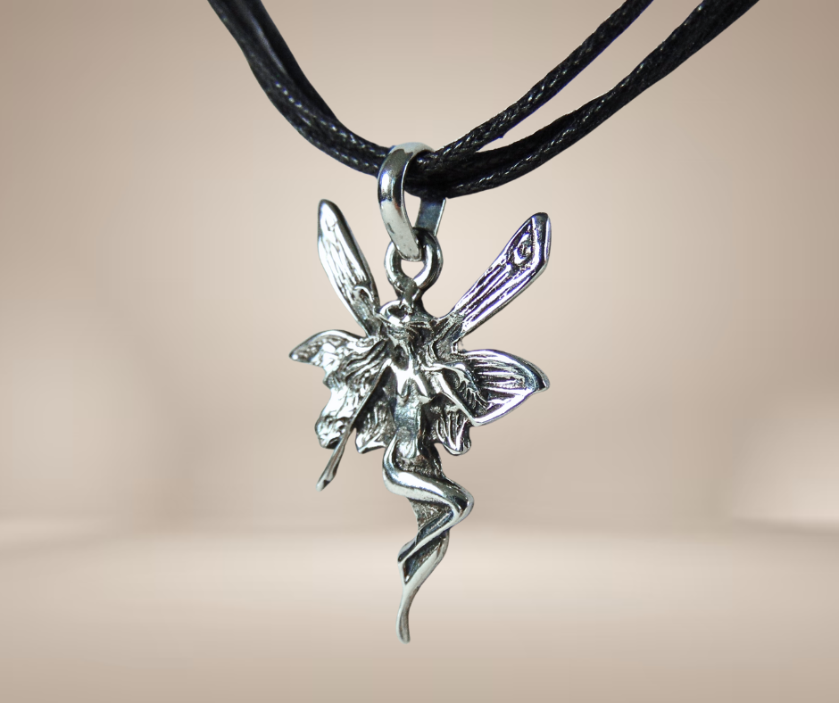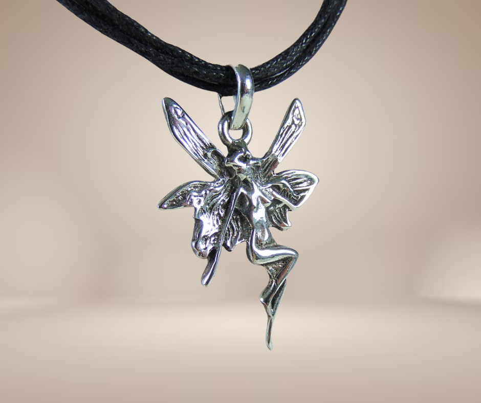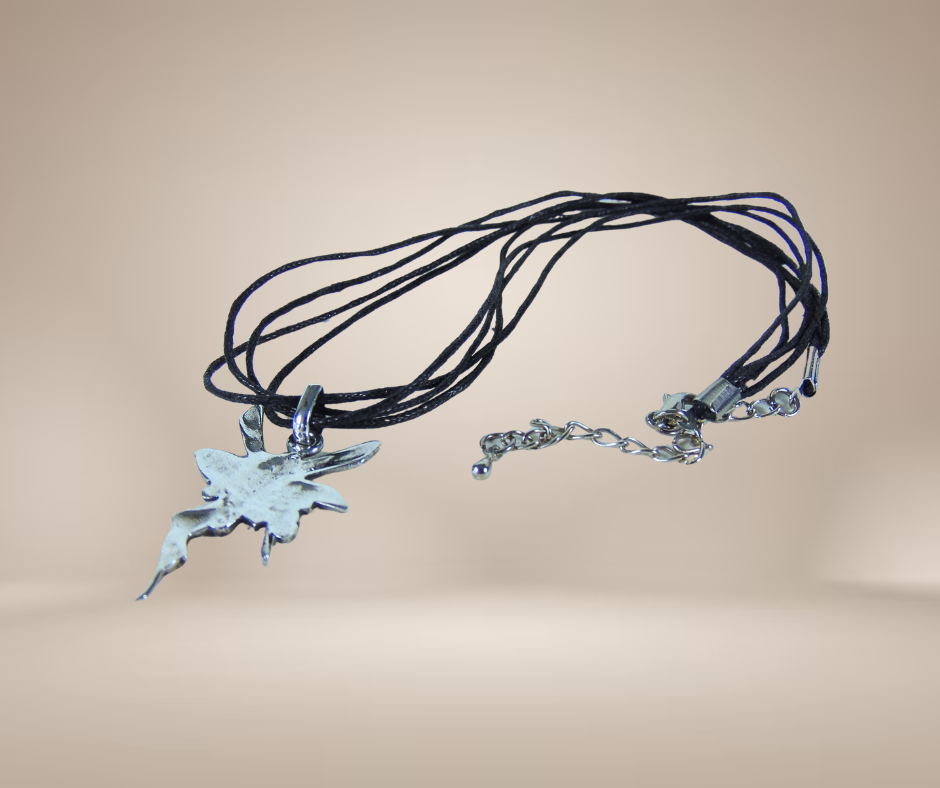 Mooie nieuwe massief zilveren hanger, in de vorm van een fee of elfje aan een veterketting bestaand uit 4 strengen met een zilverkleurige karabijnsluiting.