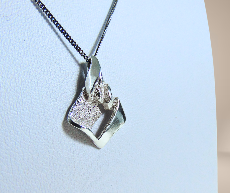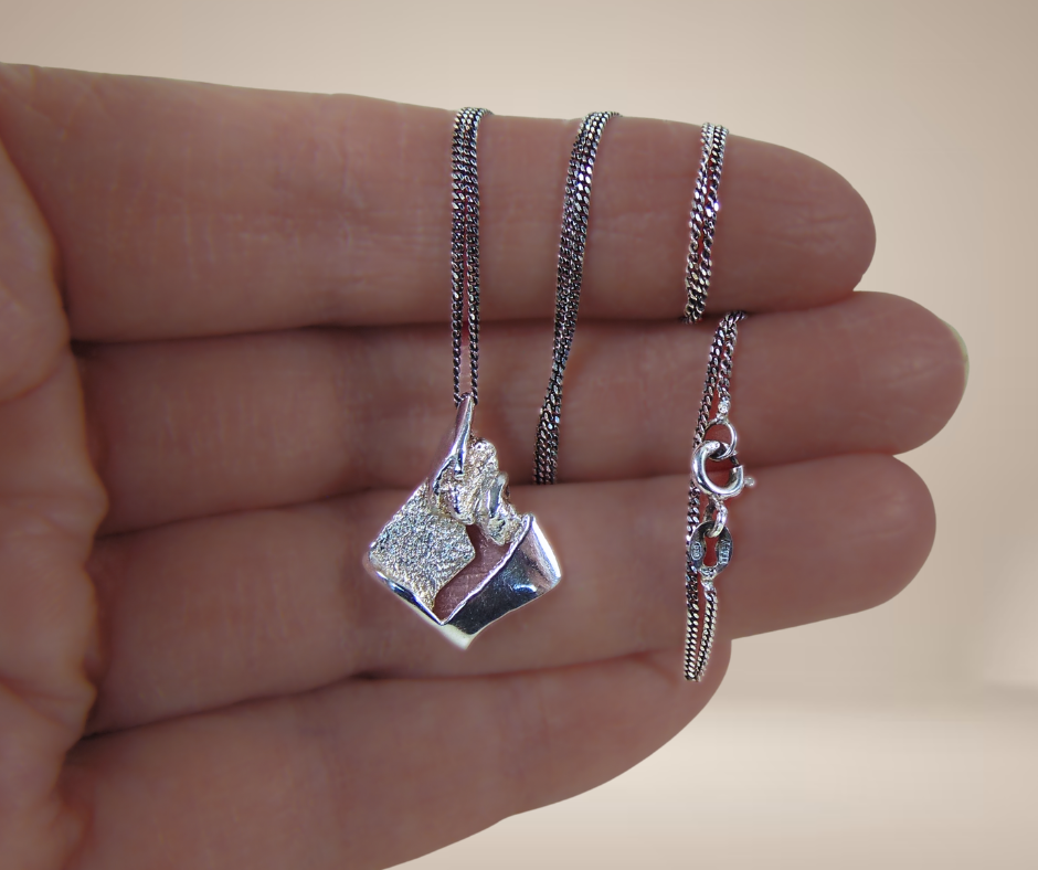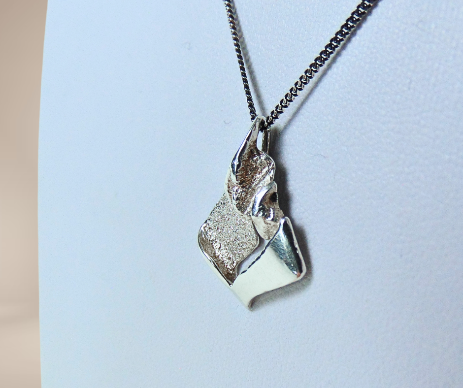 Fantastische zilveren brutalistische hanger, in de jaren ’70 met de hand gemaakt door designer Alpo Tammi Koru uit Finland. De hanger is gemaakt met het contrast tussen glimmend zilver en ruwe zilveren oppervlakten, wat een stoer maar ook sierlijke uitstraling geeft. De ketting van het merk Italy wordt meegeleverd.