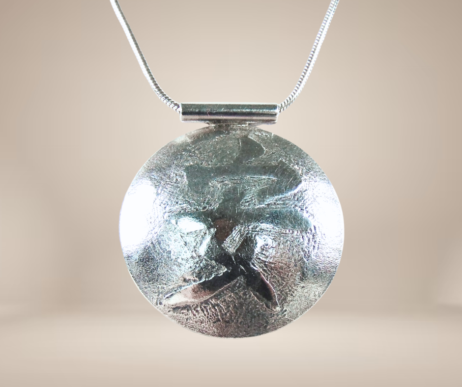 Schitterende zware kwaliteit grote zilveren bolle amulethanger, aan de voorkant gematteerd met daarin in glanzend contrast het Chinese teken voor persoonlijke sereniteit, veiligheid en innerlijke kalmte. De zilveren slangschakel ketting met toggle-sluiting hoort bij de hanger.