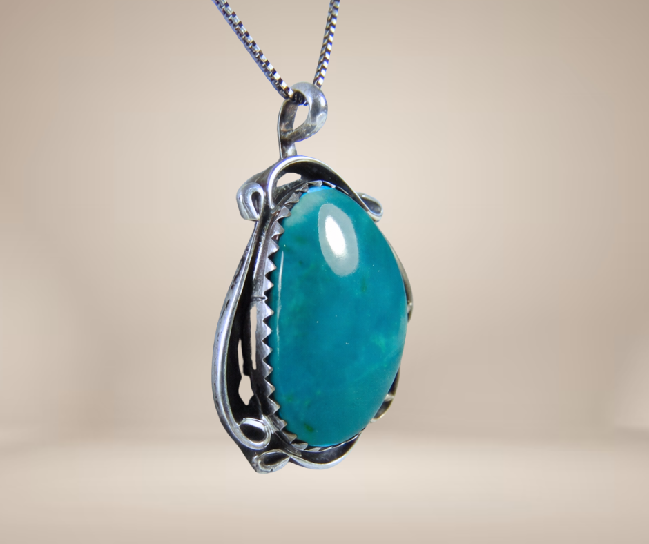 Schitterende zilveren hanger, met de hand gemaakt door de Native American zilversmeden van de Navajo stam. De hanger is gezet met een prachtige turquoise cabochon en heeft een sierlijk krullende zetting.