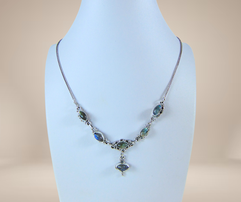 Schitterende handgemaakt zilveren lavalier of Y-ketting met sierlijk gevormde schakels met navette labradoriet cabochons. De ketting is op de haaksluiting gemerkt 925, het 2de gehalte slotje is er later tussen gezet.