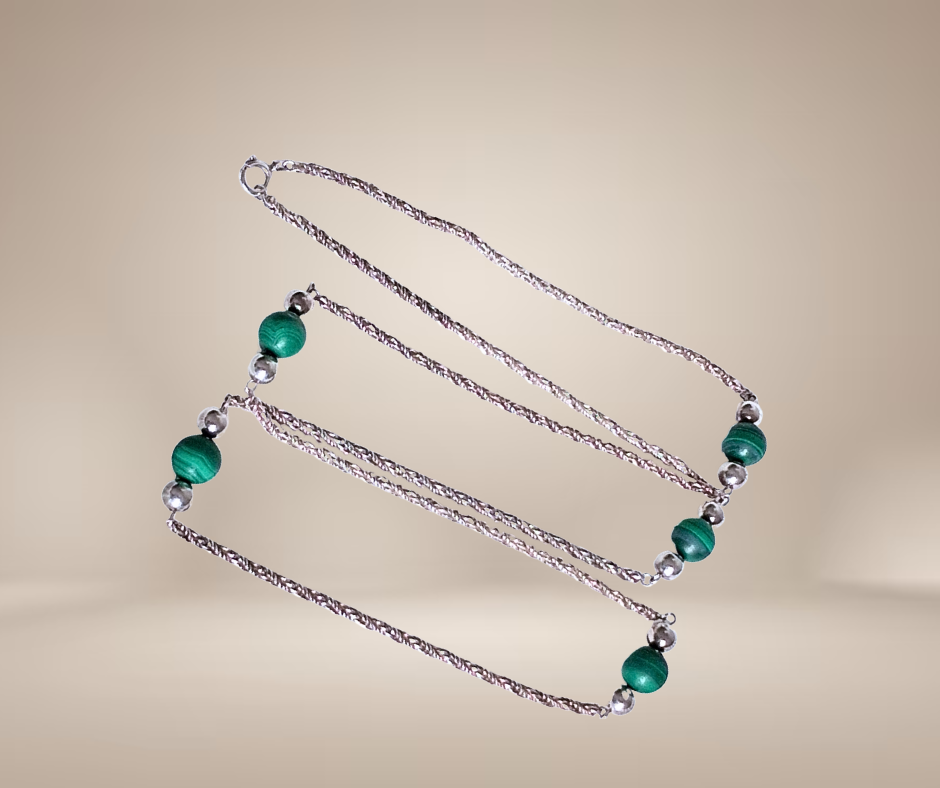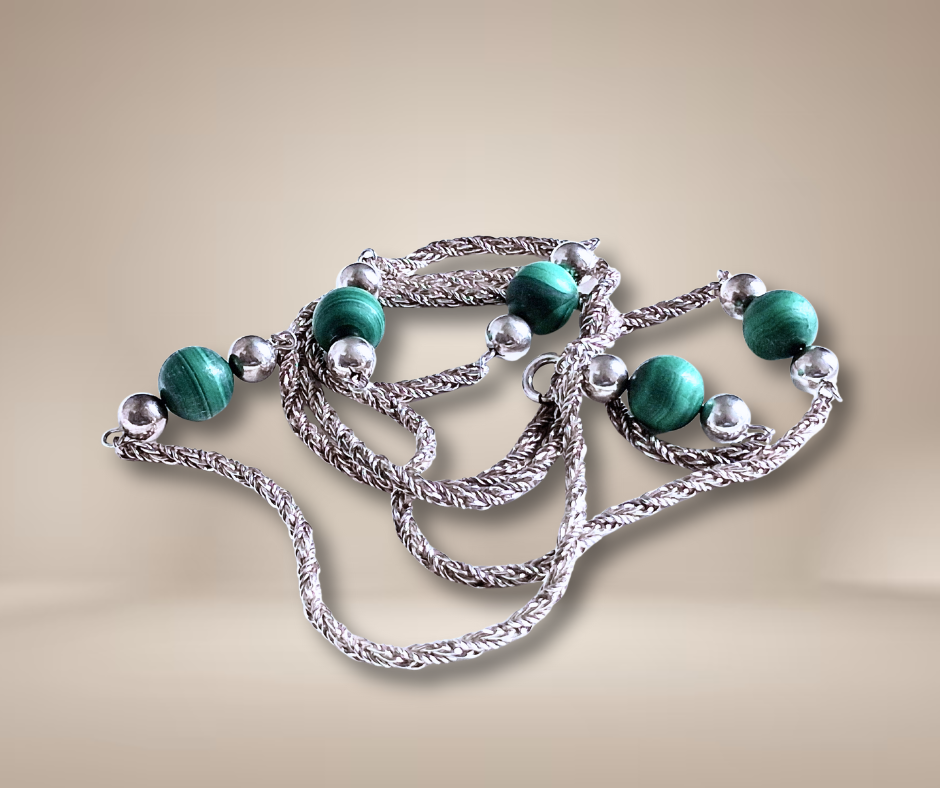 Deze zware zilveren flapper necklace met malachiet kralen is een perfecte aanvulling op je sieradencollectie. De ketting is gemaakt van hoogwaardig gevlochten zilver en heeft prachtige groene malachiet kralen die de aandacht trekken, geflankeerd door grote zilveren kralen. Het ontwerp hoort helemaal thuis in ‘the roaring twenties’ en zal je outfit een vleugje glamour geven. Of je nu naar een feestje gaat of gewoon een dagje uit, deze ketting zal je look compleet maken. Ik heb helaas de maker niet kunnen vinden.