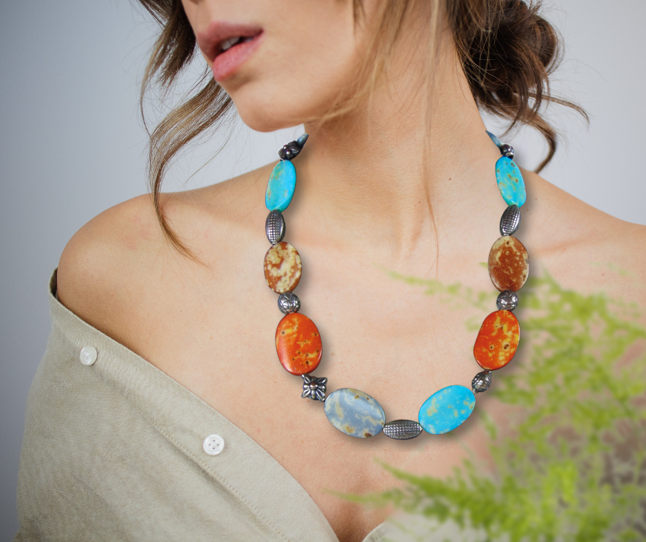 Supermooie en unieke vintage ketting, geregen van verzilverde bewerkte kralen in allerlei vormen en grote ovale ‘bicone’ stenen kralen. De ovale kralen zijn plat maar lopen naar de uiteinden toe breder uit. De stenen zijn geverfd howliet in turquoise, oranje, bruin en jeansblauw.