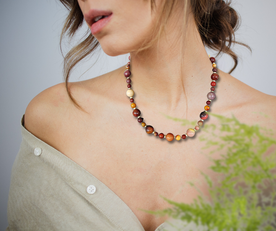 Supermooie ketting gemaakt van verschillende maten en aardekleuren rond gepolijste agaat kralen afgewisseld met zilverkleurige schijfvormige kralen. De ketting heeft een zilverkleurige stevige karabijnsluiting.