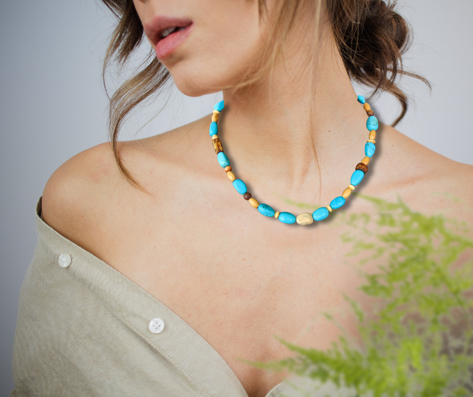 Schitterende ketting gemaakt van gepolijste natuurlijke turquoise afgewisseld met been, zaden en agaat. De ketting heeft een 925 zilveren toggle sluiting.