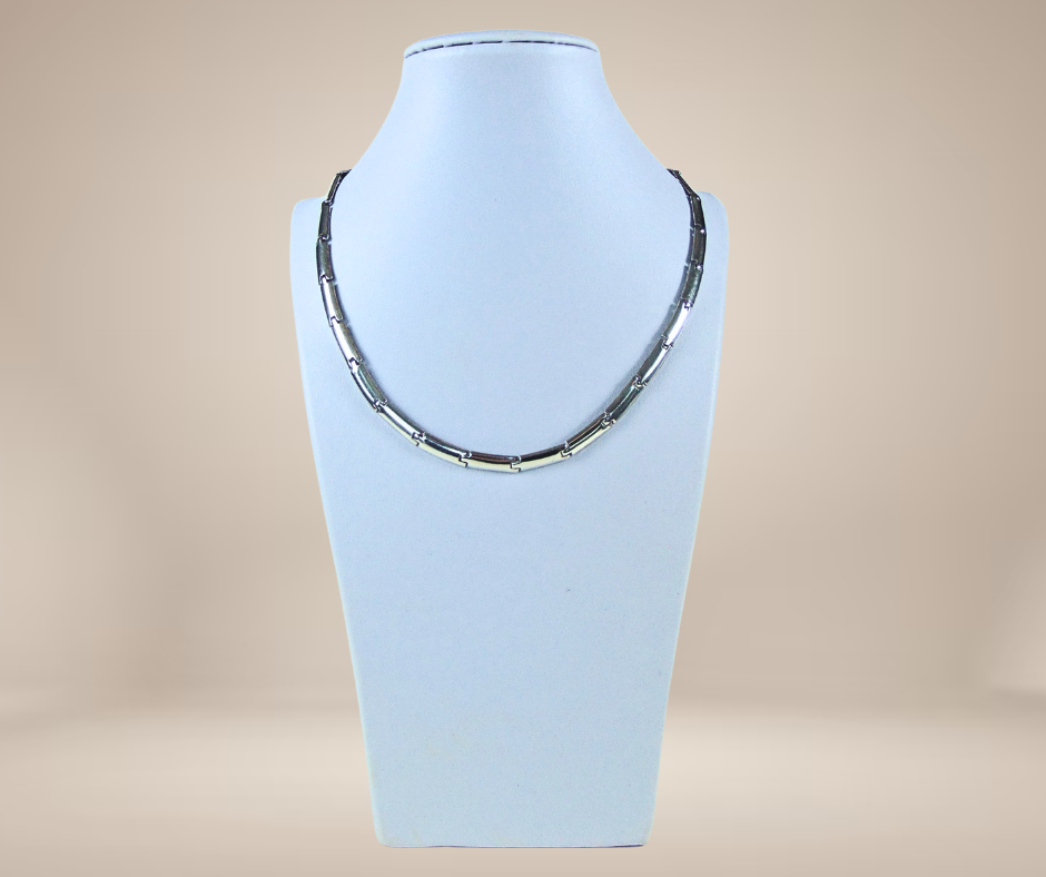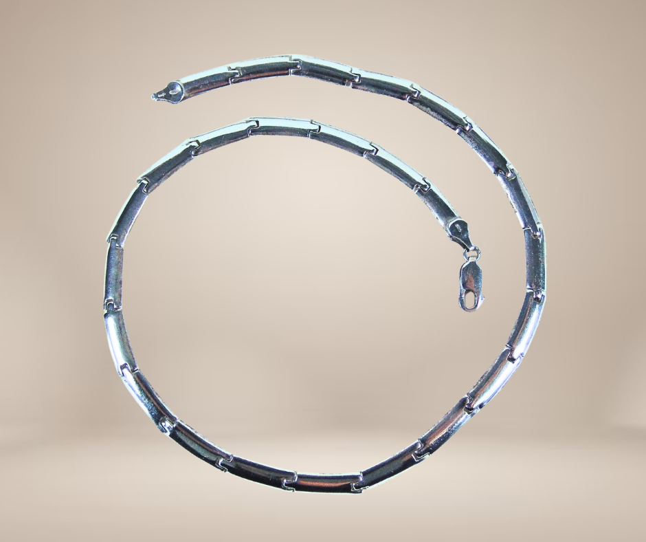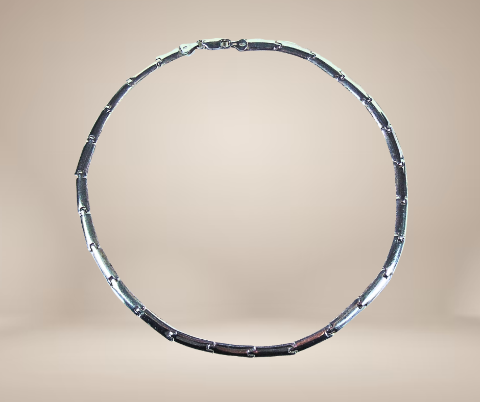 Prachtige massief zilveren schakelketting, gemaakt van schakels die gebold zijn en heel mooi gekromd zijn vormgegeven zodat het een soepel geheel vormt. De ketting is naast de zilverkeuren gemerkt met een makersmerk, maar ik heb helaas niet de maker kunnen achterhalen. Hij heeft een typische Scandinavische ‘vibe’.