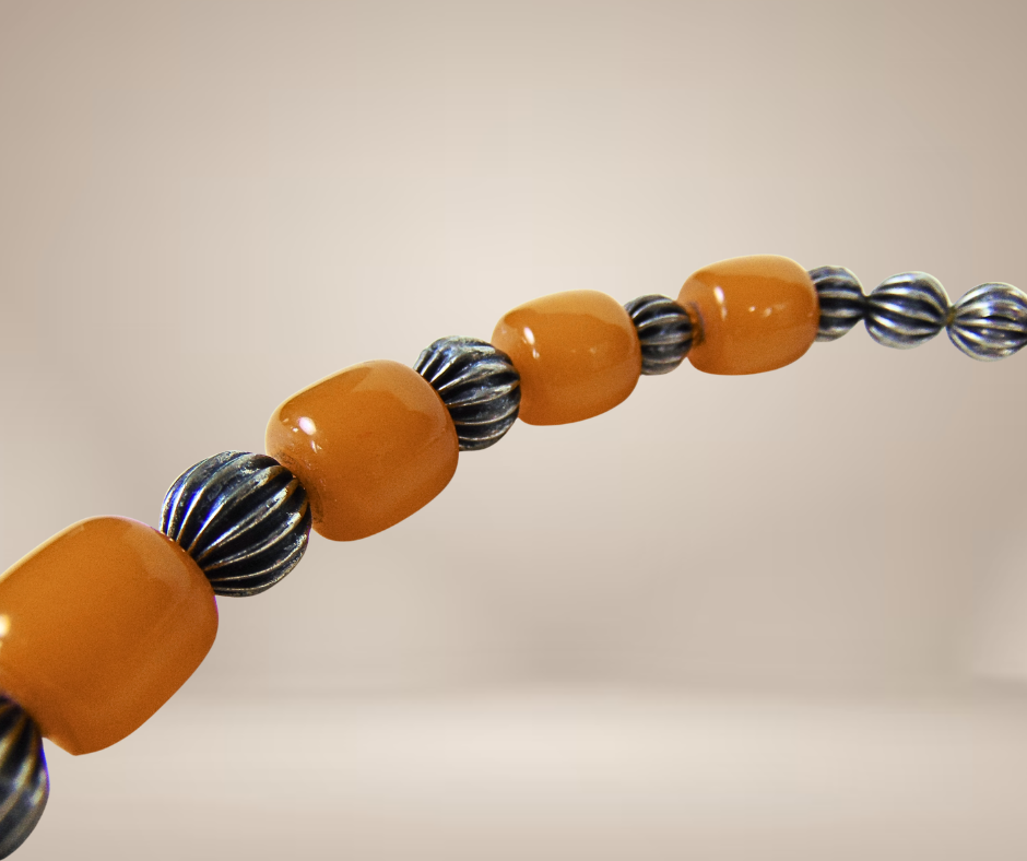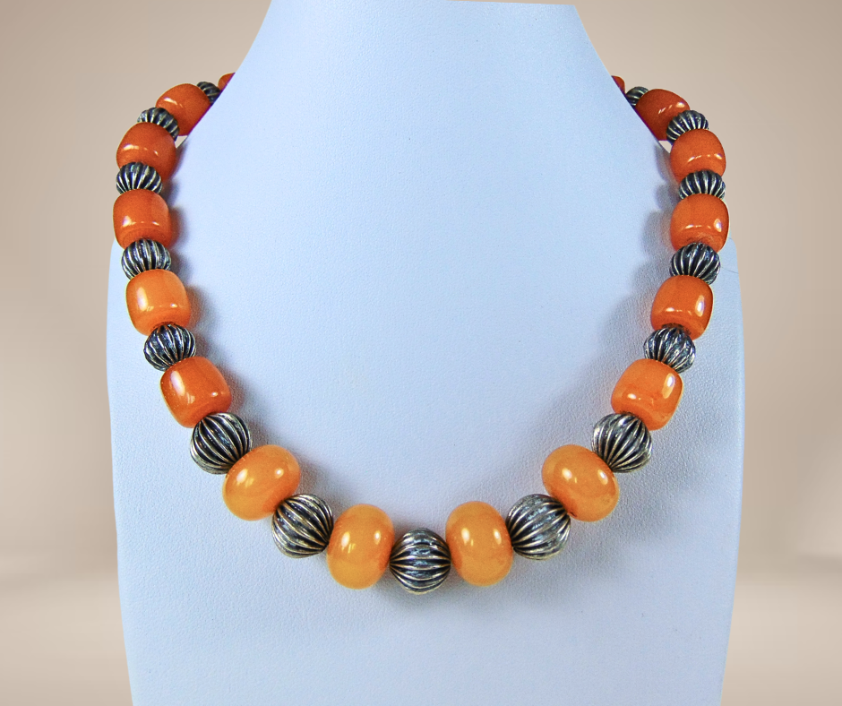Schitterende vintage Berber ketting, geregen met Afrikaanse butterscotch amber en mooi bewerkte verzilverde spacers. Hij heeft een later toegevoegde Italiaans zilveren bolsluiting. De copal kralen zijn in het middelste deel donutvormig en naar de hals toe tonnetjesvormig, ze hebben mooie kleine natuurlijke streepjesvormige insluitstels. Het collier is in zeer goede staat, met alleen slijtage van verzilvering aan een paar kralen dichtbij de sluiting.