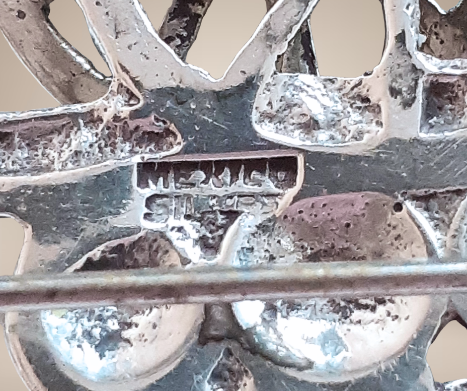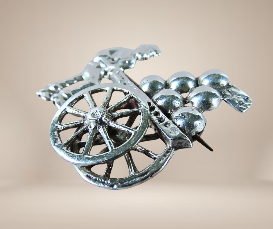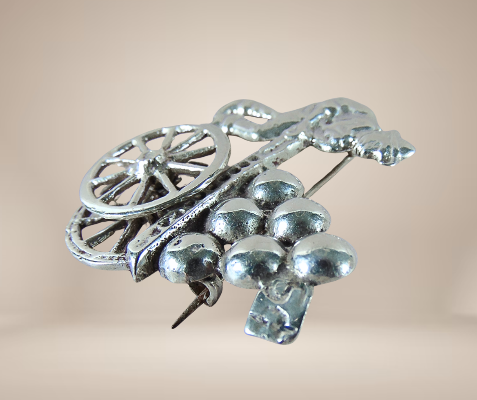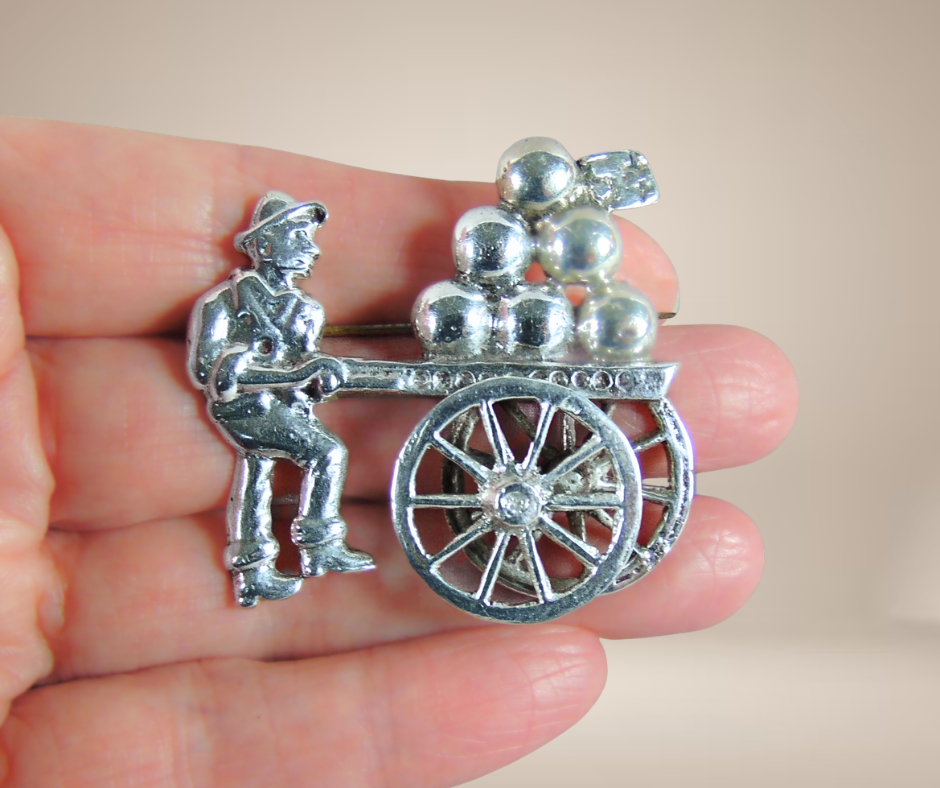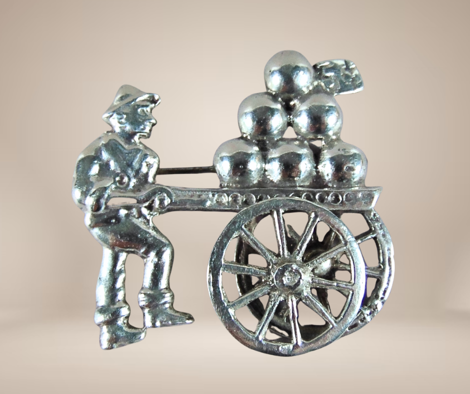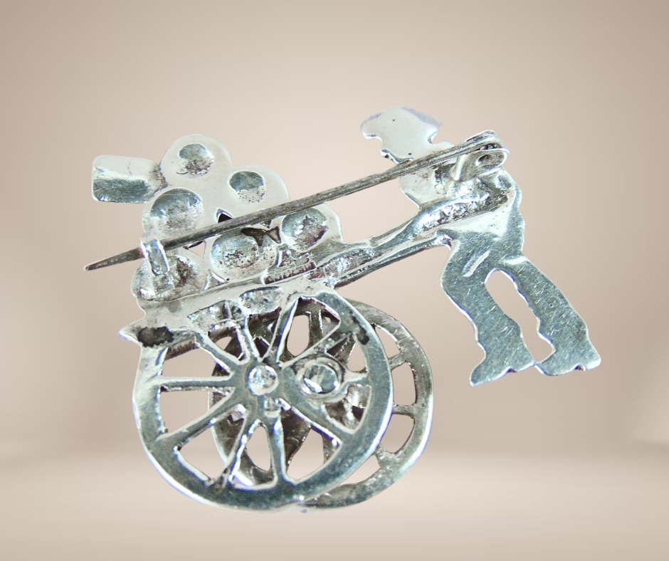 Prachtige antieke, in Mexico handgemaakt zilveren broche, uit de jaren 30 van de vorige eeuw. Het is een marktkoopman met een wagen vol met meloenen. Wat deze broche nog zeldzamer maakt is dat het voor de kijker voorste wiel daadwerkelijk draait! Hij heeft een eenvoudige goedwerkende speld met haaksluiting.