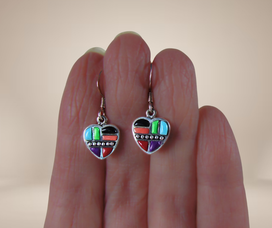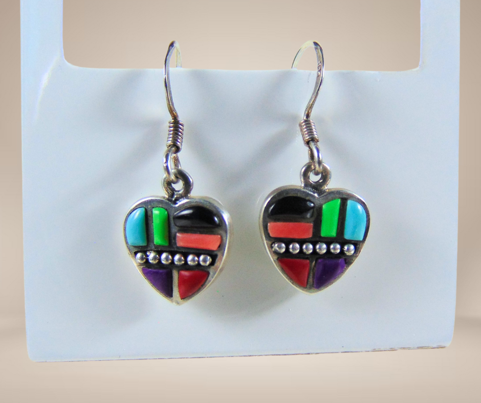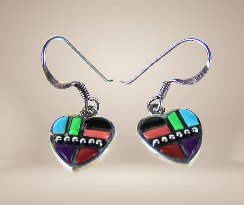 Prachtige zilveren oorbellen in Zuni stijl, gemerkt 925 en mooi ingelegd met multi kleurige cobble stones of kinderkopjes.