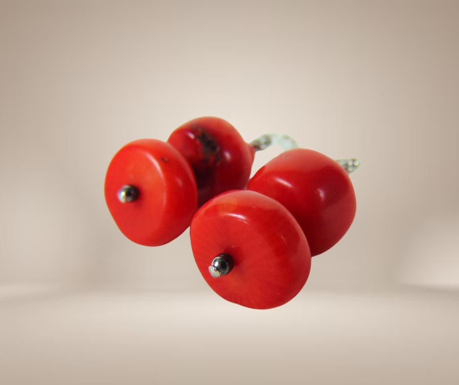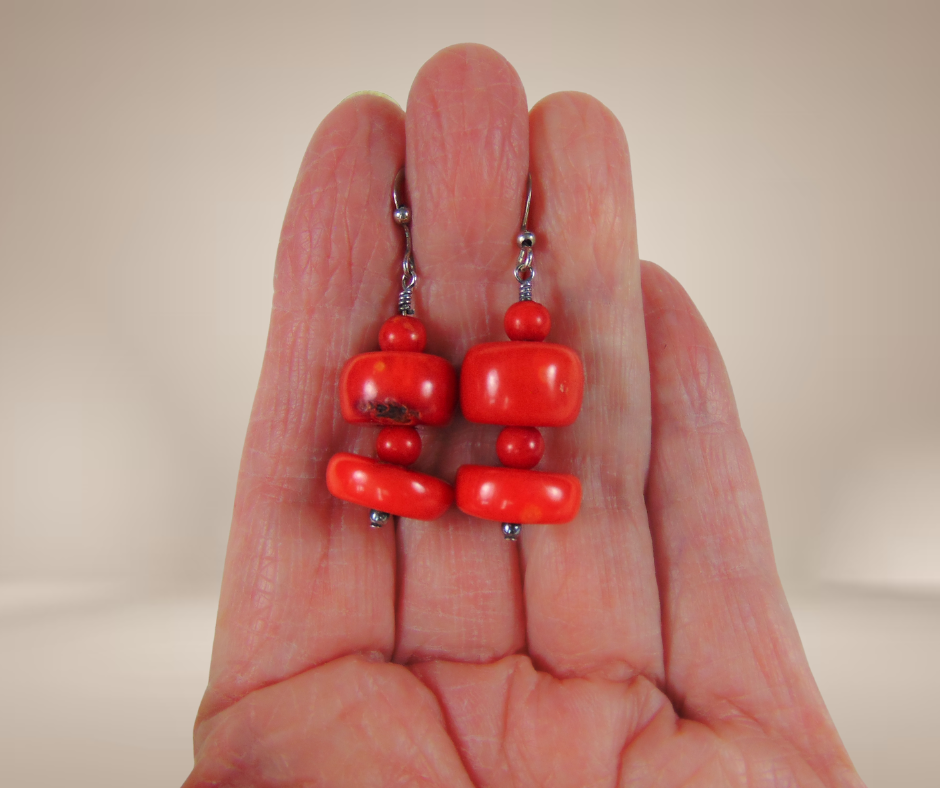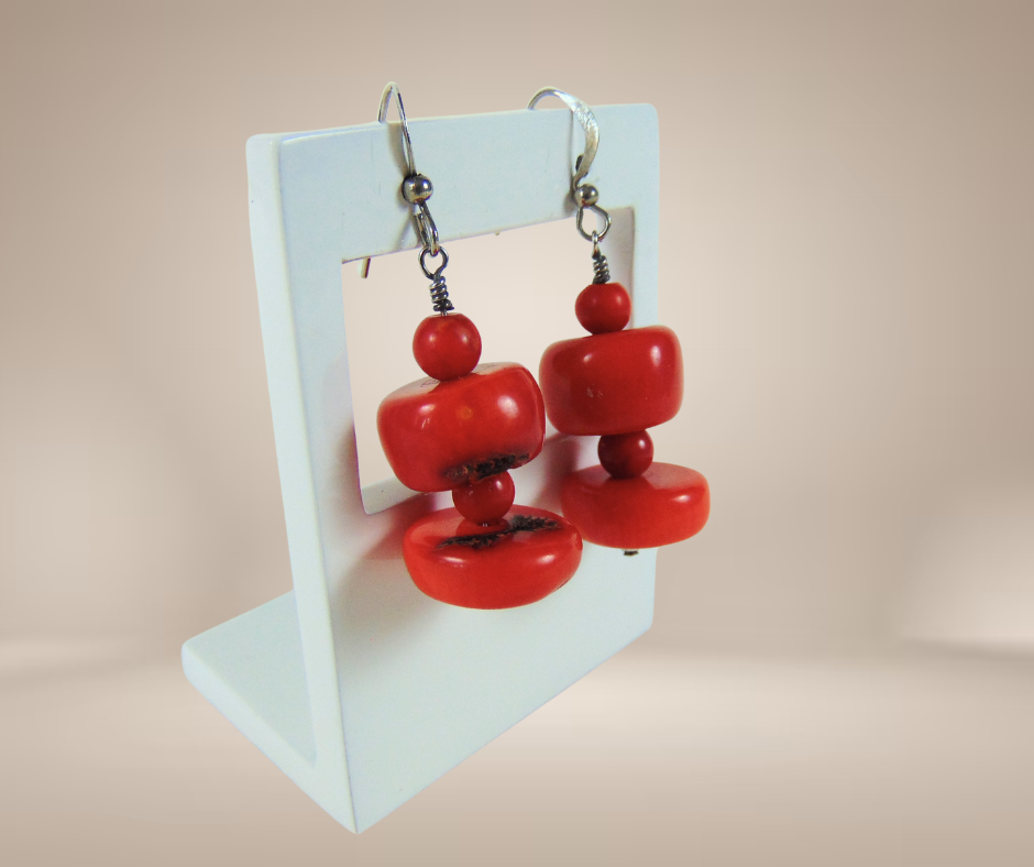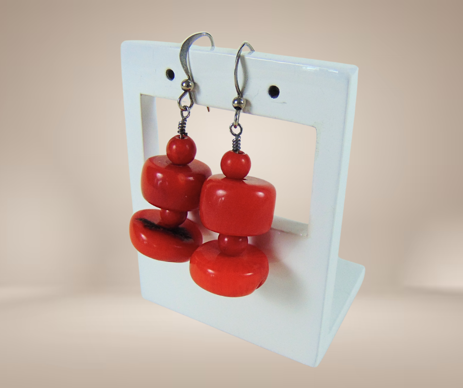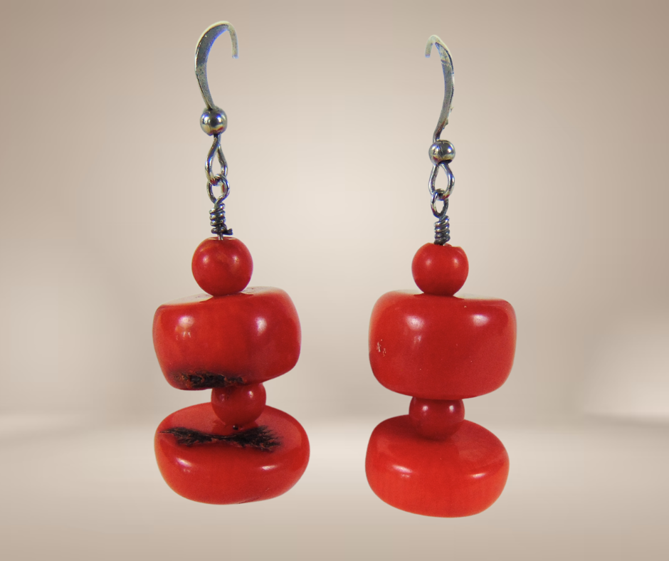 Mooie opvallende oorbellen gemaakt van antieke herbruikte kralen in ronde en in tonnetjes vorm. Ze hebben wat natuurlijke tekenen, waardoor ze zich onderscheiden van bamboekoraal of andere imitaties. Ze hebben zilverkleurige haken.