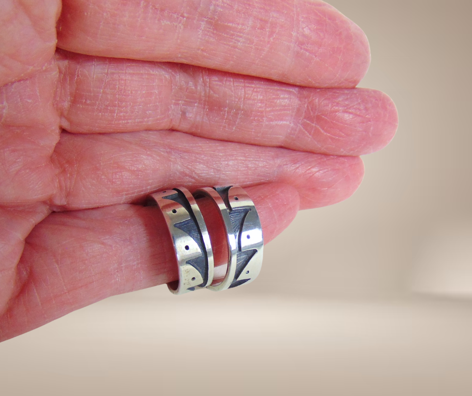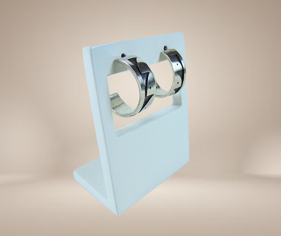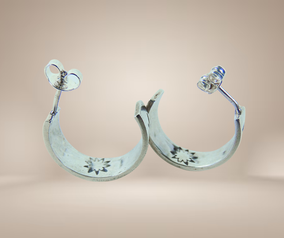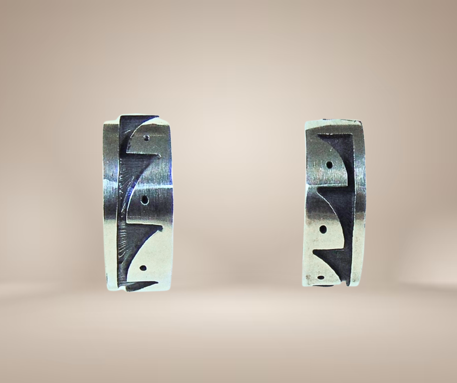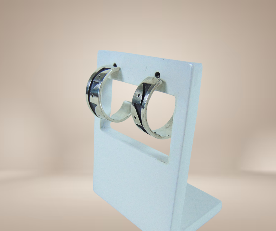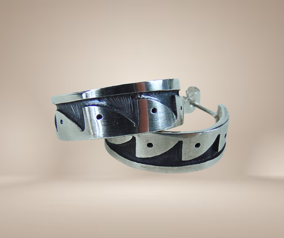 Schitterende zilveren creolen oorbellen, met de hand gemaakt door de Native American zilversmeden van de Hopi-stam. De oorbellen zijn in typische Hopi overlay techniek gemaakt, waarbij de onderste laag zilver zwart wordt geoxideerd. Hierna wordt de bovenste laag geplaatst, met dit soort prachtige uitgezaagde geometrische tribal patronen. Dit geeft een magisch contrasterend geheel. Deze oorbellen zijn versierd met geometrische patronen die regen weergeven.