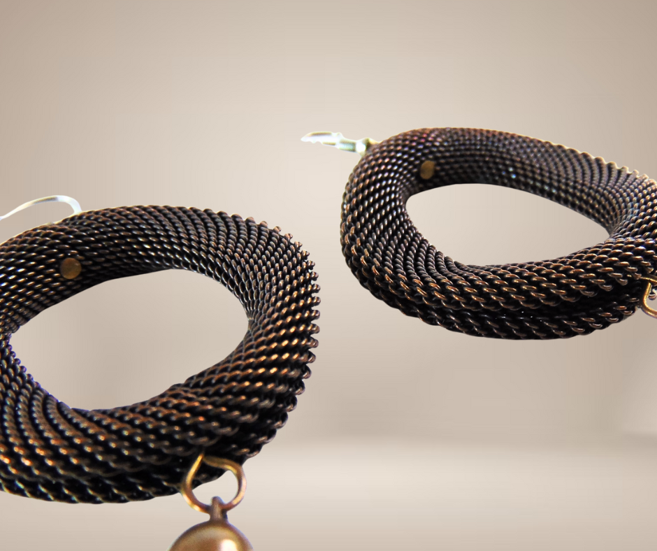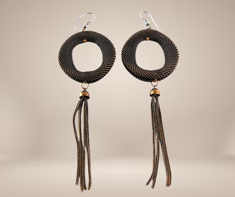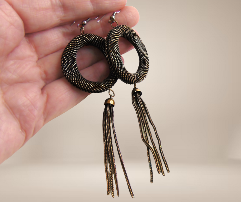 Prachtige kwaliteit koperen of bronzen oorbellen. De grote ‘donuts’ zijn strak gevlochten of geweven en zijn veel mooier van vorm dan ik kan omschrijven, daaronder hangen speelse lange kwastjes.