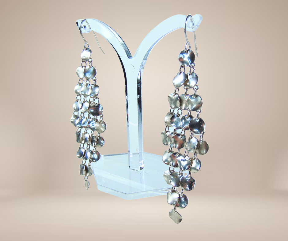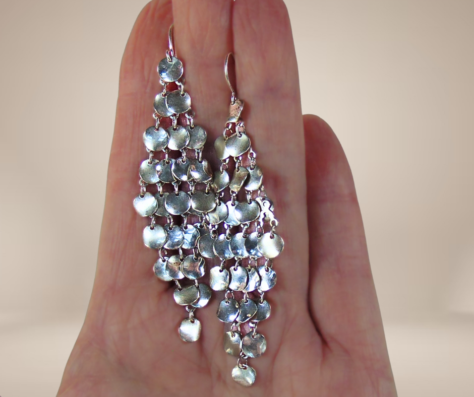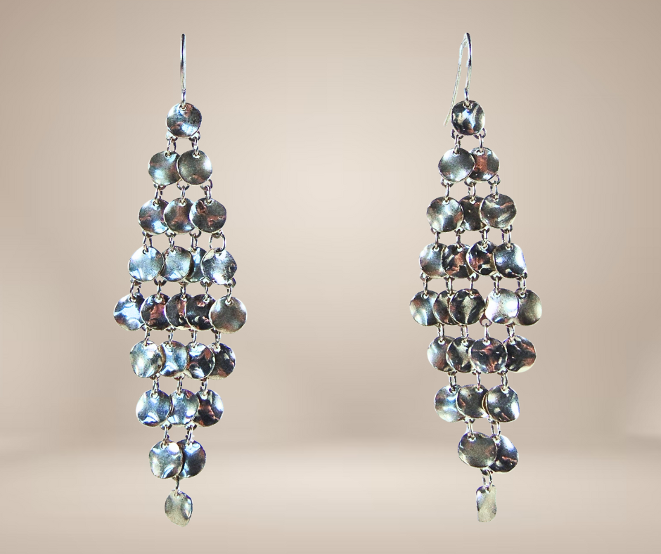 Hele mooie kwaliteit vintage ‘waterval’ of mesh oorbellen in zilver metaal. Elk schijfje is individueel vastgemaakt. De schijfjes vallen hierdoor mooi over elkaar heen en ze zijn ook bewerkt waardoor ze nog meer sprankelen, echte eye catchers!