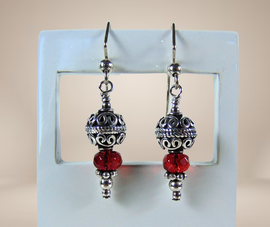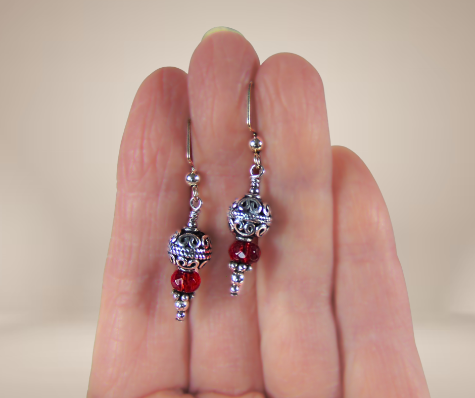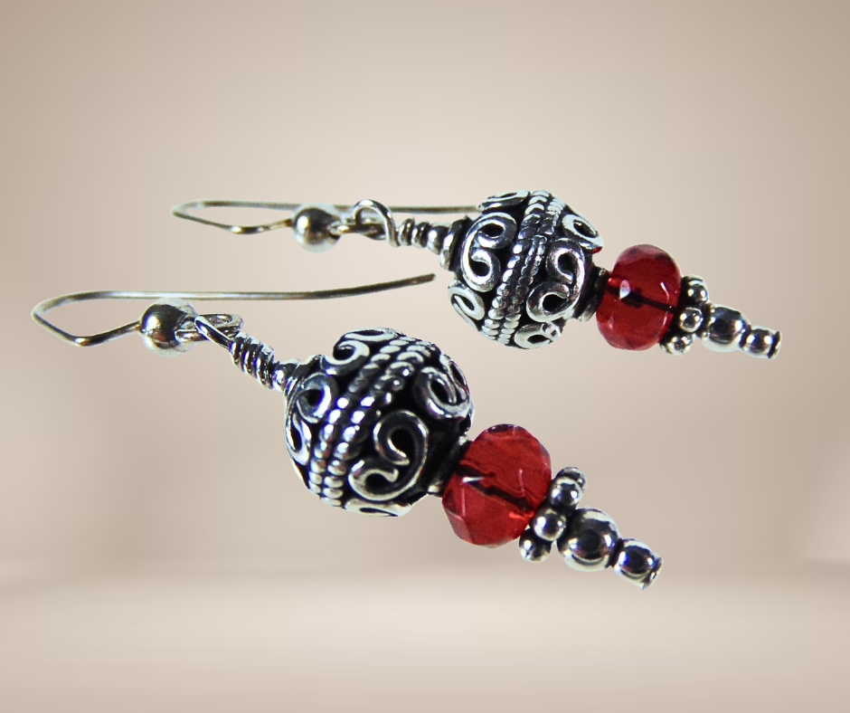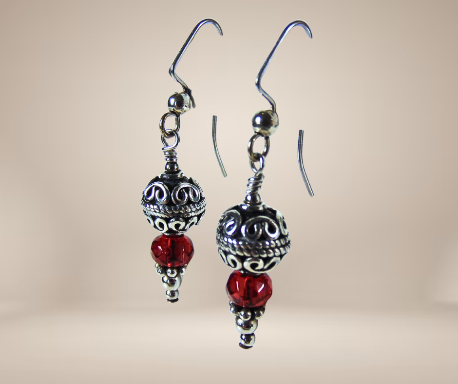 Mooie vintage zilverkleurige oorbellen met rode glaskraal