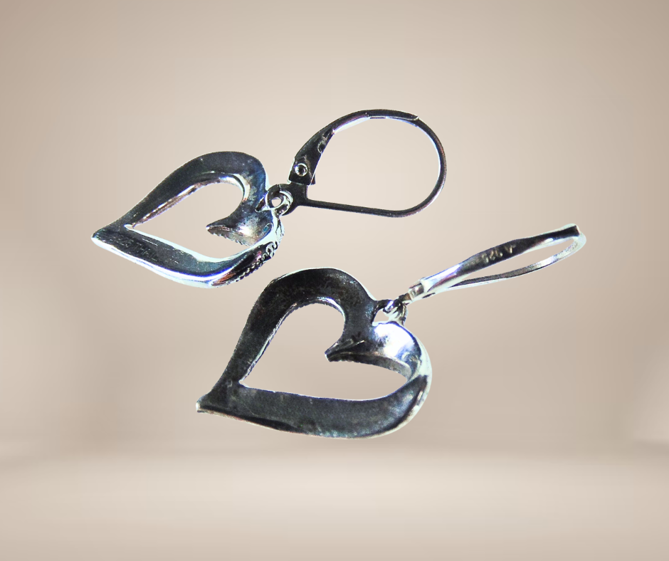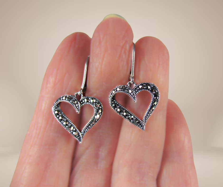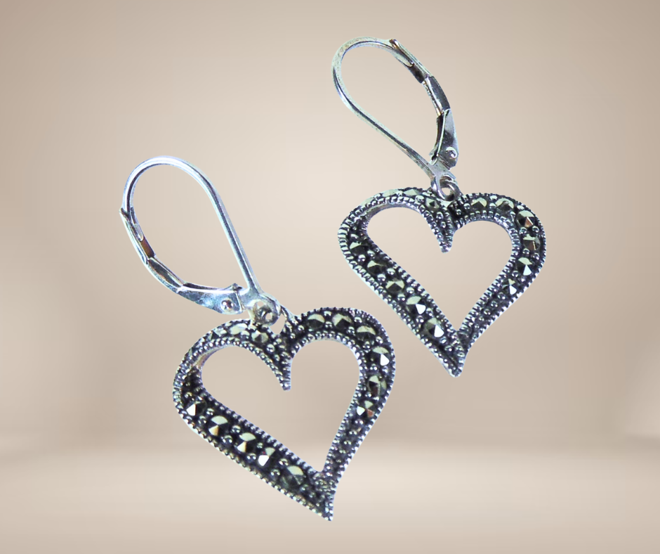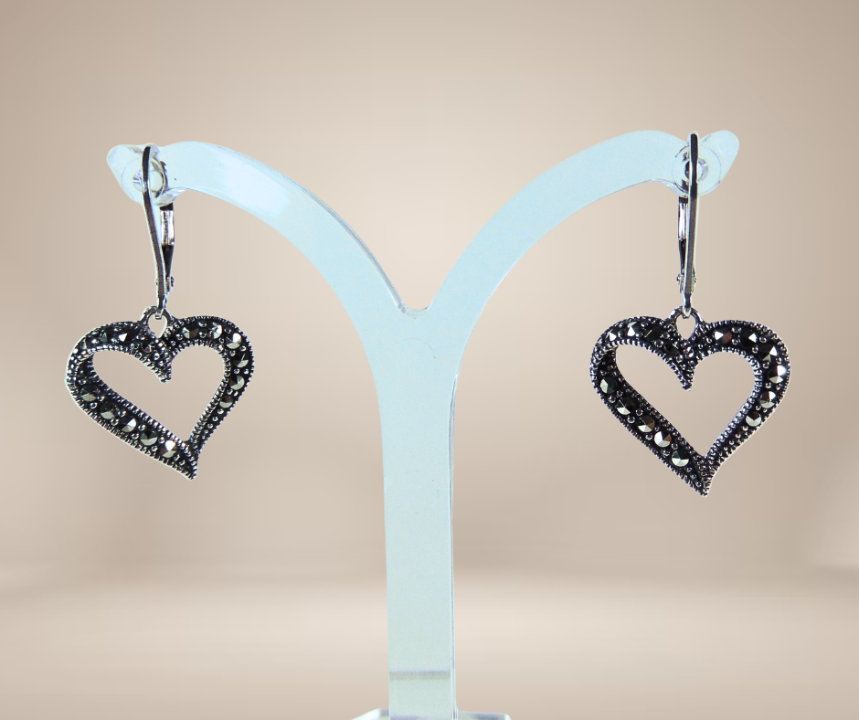 Prachtige zilveren oorbellen in een sierlijke open hart vorm, gezet met markasiet.