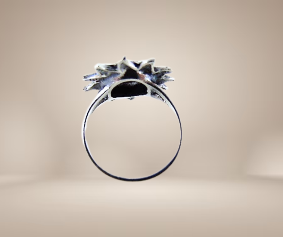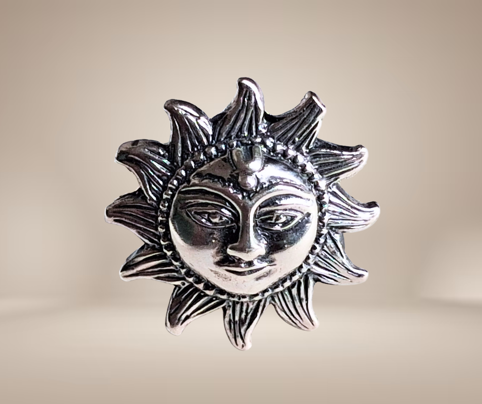 Mooie zilveren ring in de vorm van een Oosters zonnegezicht met een bindi op het voorhoofd.