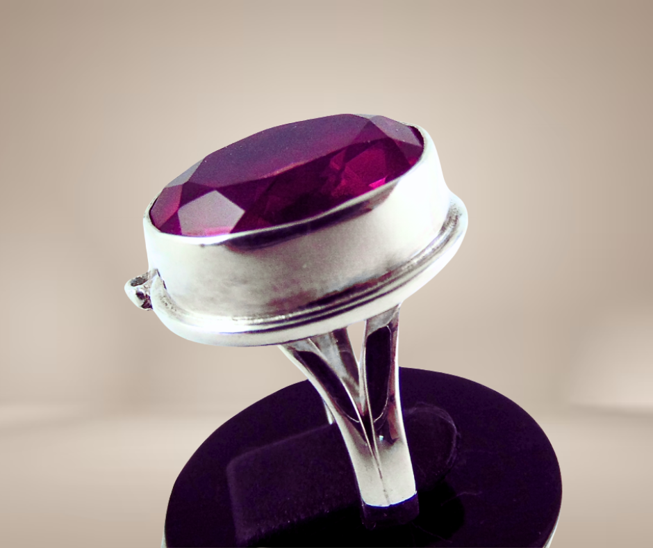 Prachtige grote handgemaakte zilveren ring, gemerkt 925 en gezet met een grote ovale facet geslepen robijnrode glassteen met daarnaast een druppel- en een navetvormige steen.