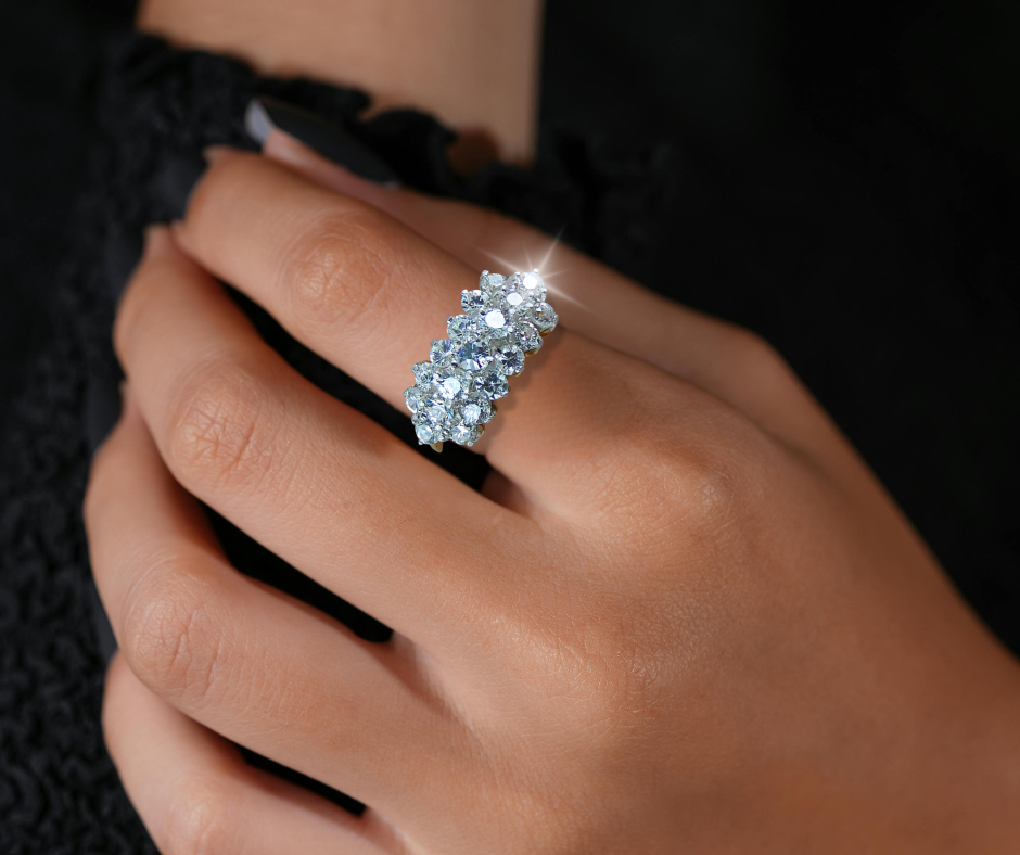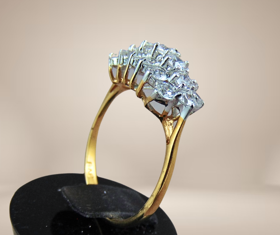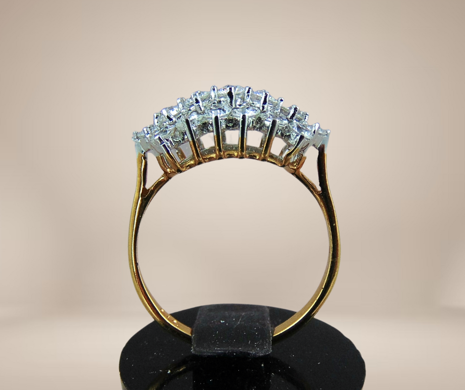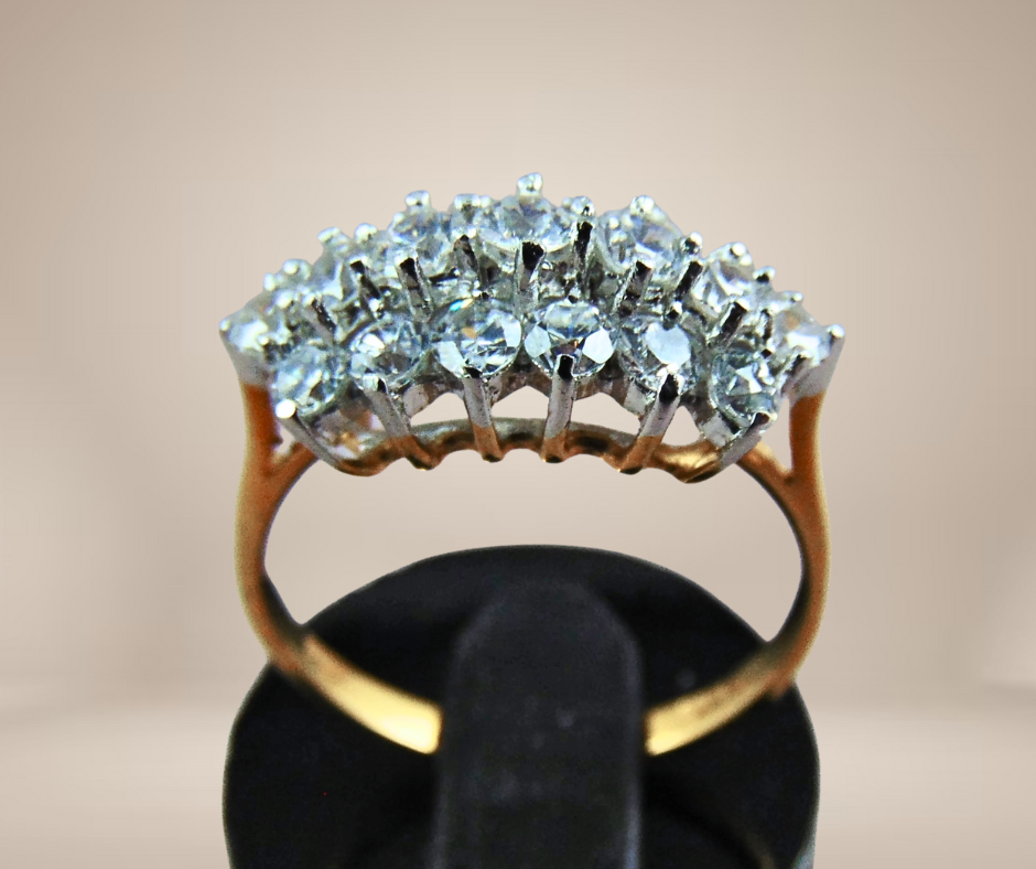 Dit is een letterlijk en figuurlijk schitterende ring, verguld in geelgoud en witgoud. De ring is van het merk DAC en is bijna niet van echt goud te onderscheiden. Hij is gezet met veel sprankelende briljant geslepen zirkonia en zou het zeer goed doen als verlovingsring of gewoon als mooi cadeau voor een geliefde.