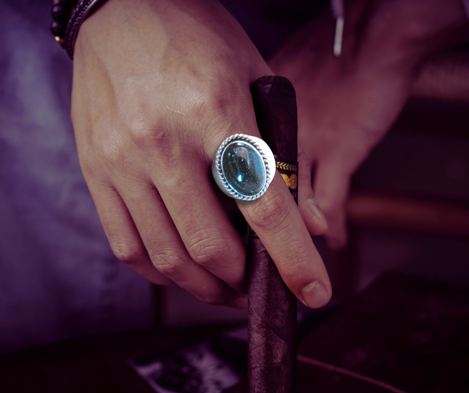 Prachtige grote en zware zilveren ring, met de hand gemaakt door de Navajo zilversmeden. Hij is gezet met een grote ovale blauwzwarte goudsteen cabochon en afgewerkt met touwwerk (roping). De ring is aan de zijkanten gedreven met tribal symbolen.