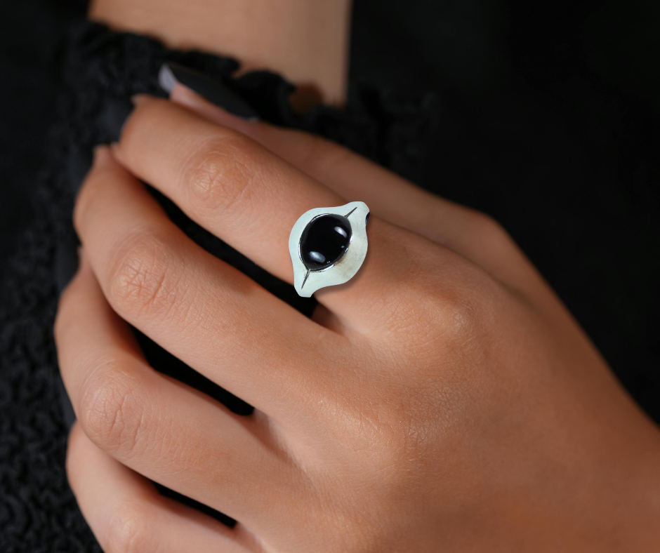 Supermooie en aparte zilveren modernistische ring, gezet met een onyx cabochon. De ring heeft een typische Space Age vormgeving waar de steen tussen wordt ‘geklemd’ of ‘valt’. De ring is in maat verstelbaar en heeft nu een maat 17,5. Wij hebben hier ook een bijpassende lavalier ketting van.